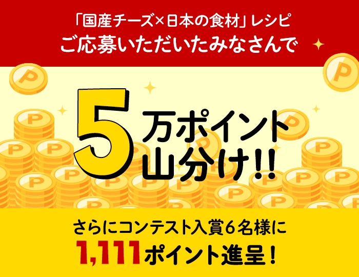 ・お一人様5レシピまで応募可能です 下記(1)~(3)の条件を満たしているものが対象となります。 (1)国産チーズと日本の食材を使用したレシピであること ※日本の食材:日本を原産国とする食材が対象 (例)米・麺類などの穀類、魚介や海藻、旬の野菜、味噌や醤油などの発酵食品、昆布や鰹節といった乾物など (2)「材料欄」に<チーズ名のあとに(国産)>を記載すること OK例:クリームチーズ(国産) NG例:クリームチーズ (3)「レシピタイトル」に【指定ワード】「国産チーズ」を記載すること。 ※レシピタイトル内に、「」内の指定ワードをそのままの表記で入れてください。 ■優秀レシピ選定基準 ・レシピ内容がわかりやすい ・料理画像がわかりやすい ・オリジナリティがある ・「おもしろい発想」「毎日のごはんが輝く」「国産チーズが主役になっている」「子どもと作れる」「国産チーズとの意外な相性」「明日作れるほど簡単」等、他ユーザが毎日の料理で作りたくなるような要素が含まれている |