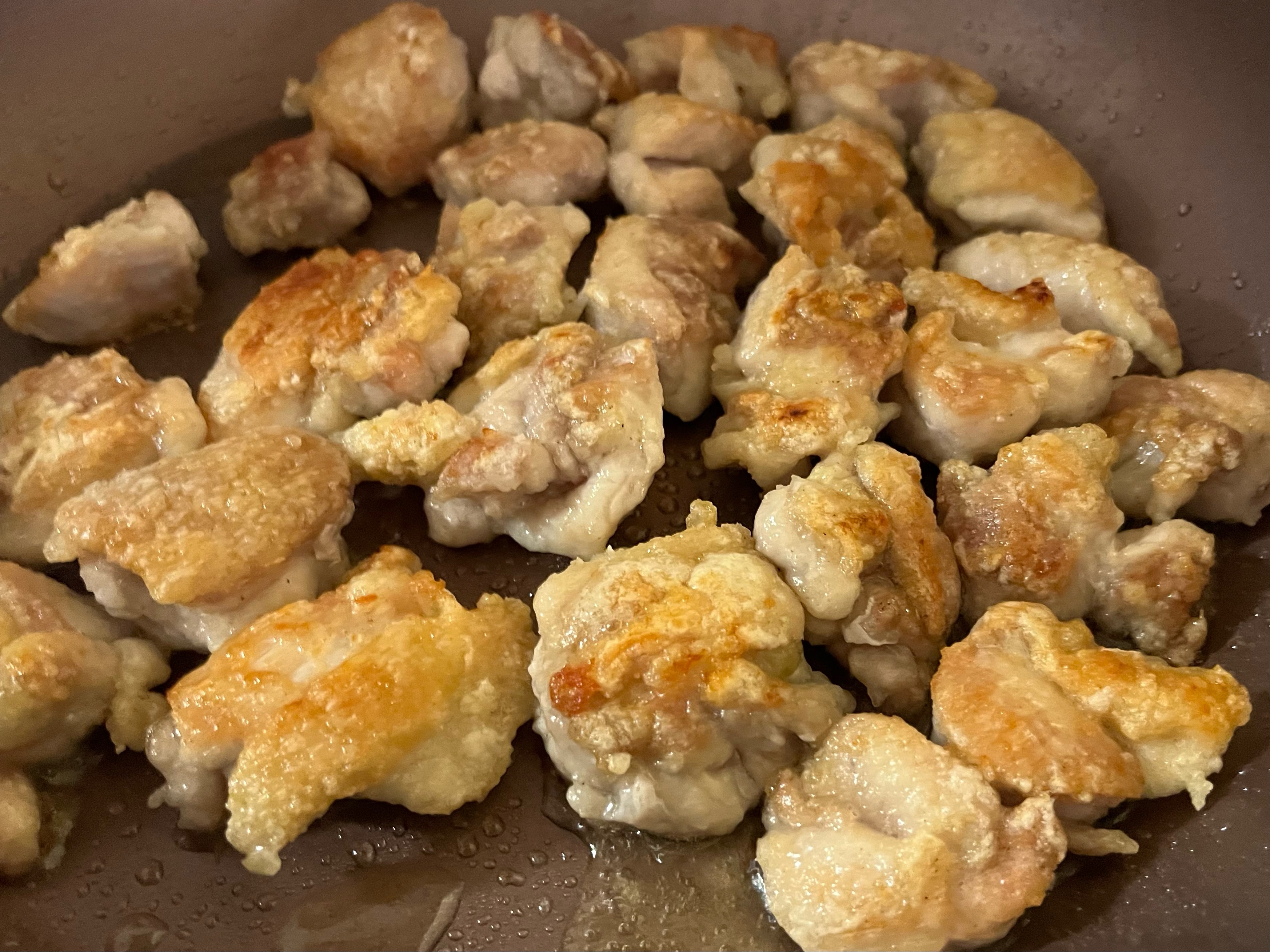 フライパンに油(分量外)を熱して鶏肉を入れ、焦げ目がついたら裏返して蓋をかけ、5分程焼いて両面カリッと焦げ目をつける。