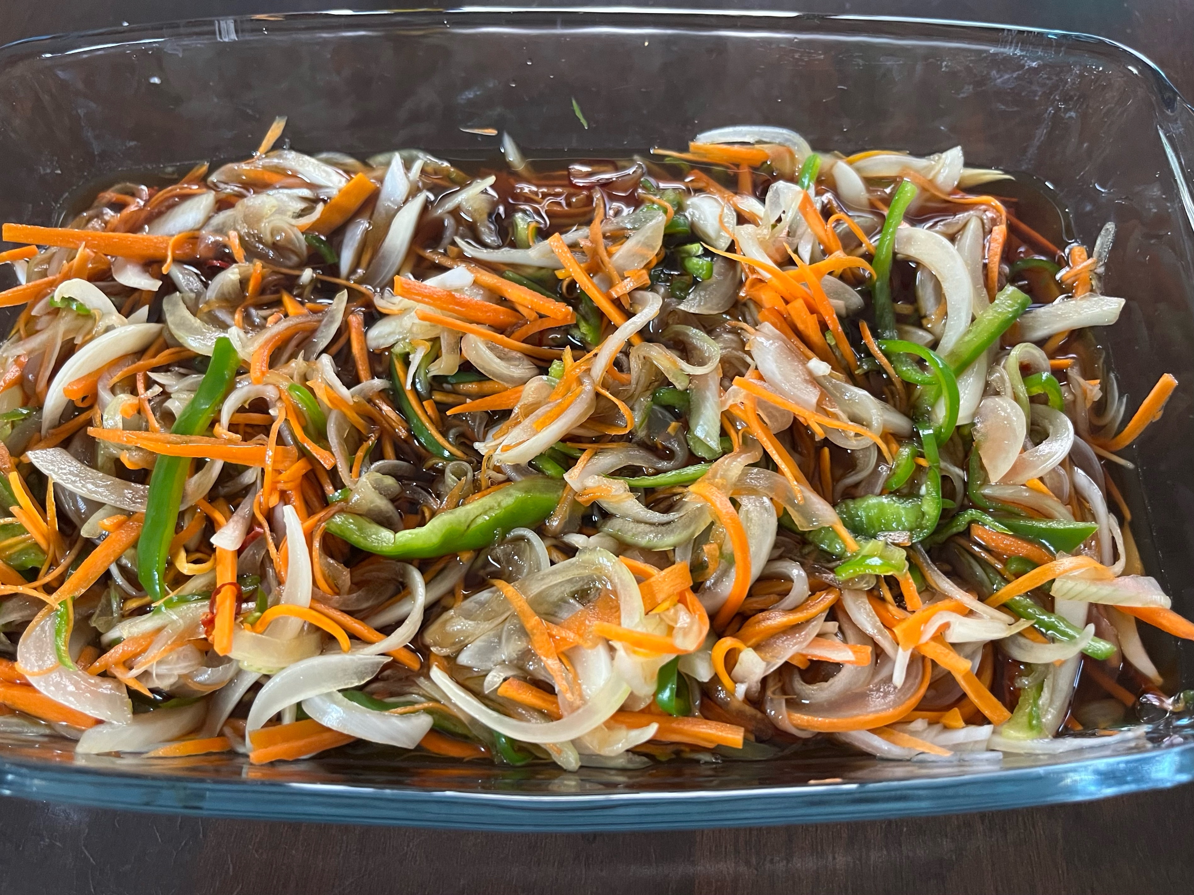 - 6 5の油を切ったら3に加え、野菜をかぶせるように乗せて粗熱をとり、冷蔵庫で冷やして完成〜。