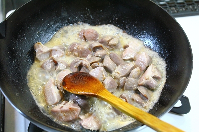 ◆砂肝に火が通ったら、蓋をとって火を強め、水分を飛ばすように炒める