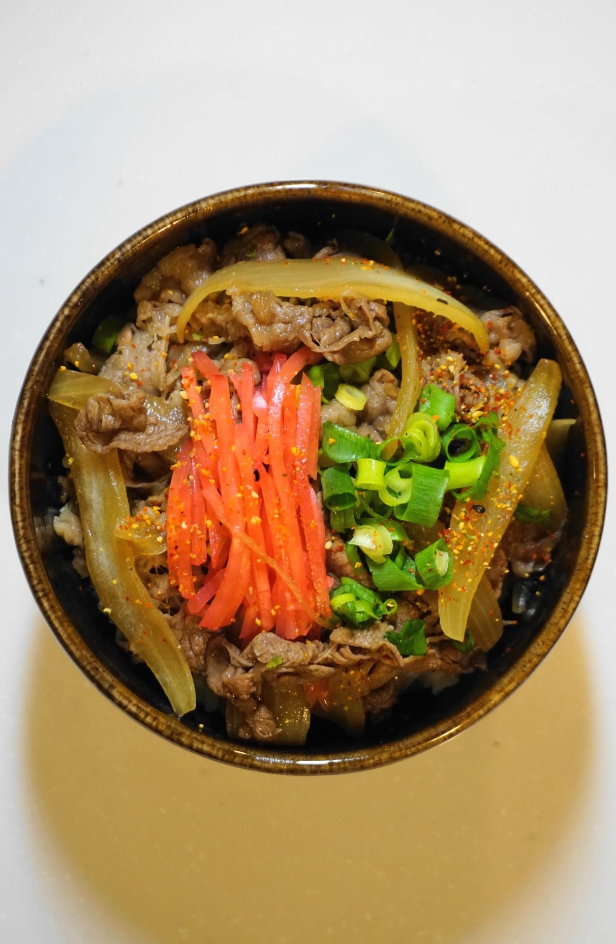 最後に器にご飯・5)の具材を盛り(汁もかける)、お好みで紅生姜・万能ねぎをのせ~七味唐辛子をふり完成。