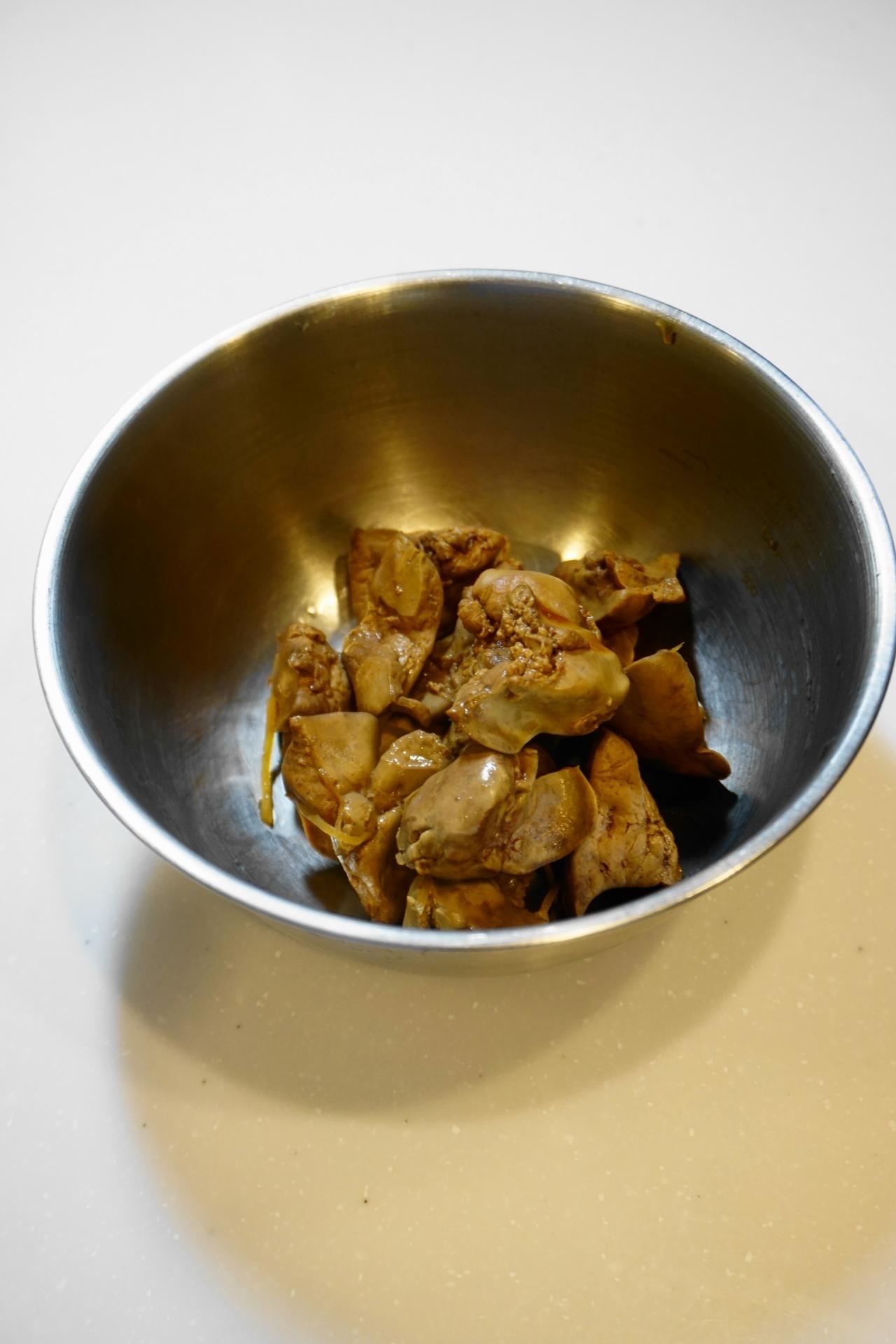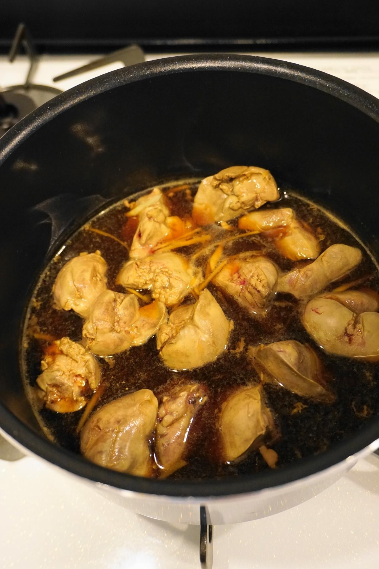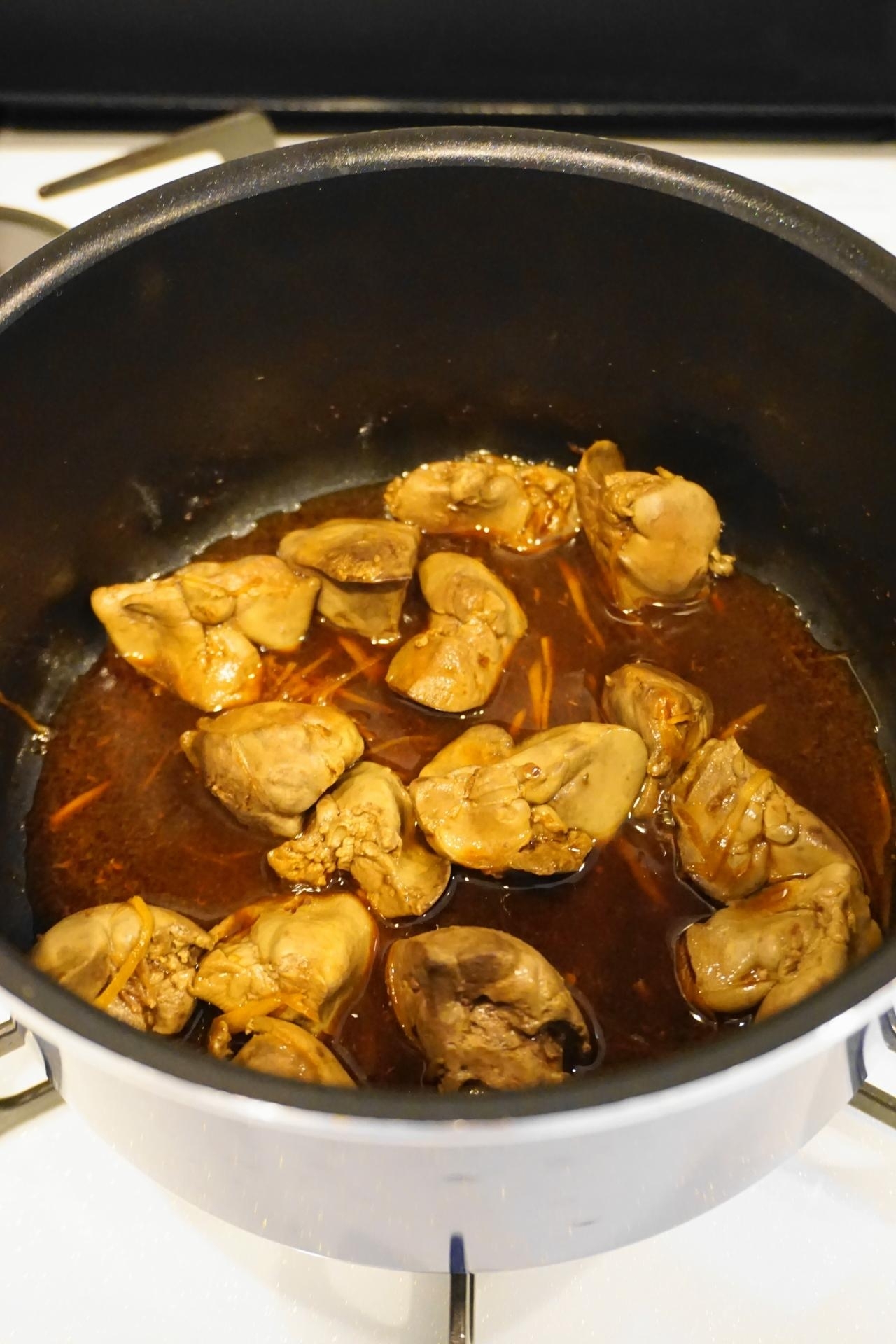続けて弱火の落として煮込み(途中上下を返して~10分くらい)~いったん鶏レバーのみ取り出す。