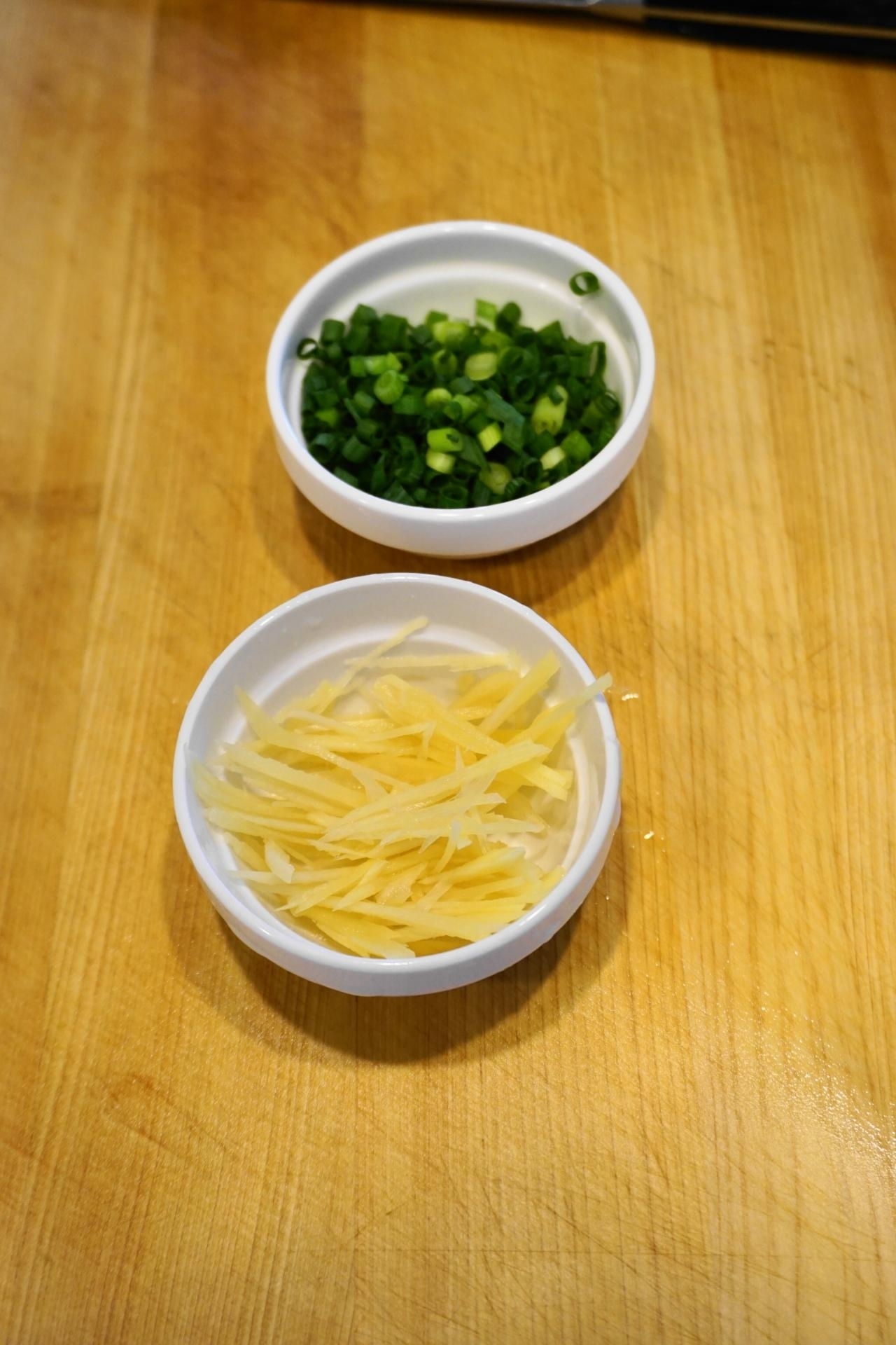 生姜は皮を剥きせん切りに、万能ねぎは小口切りにする。