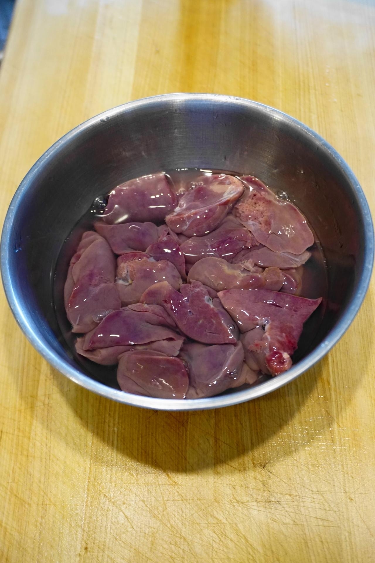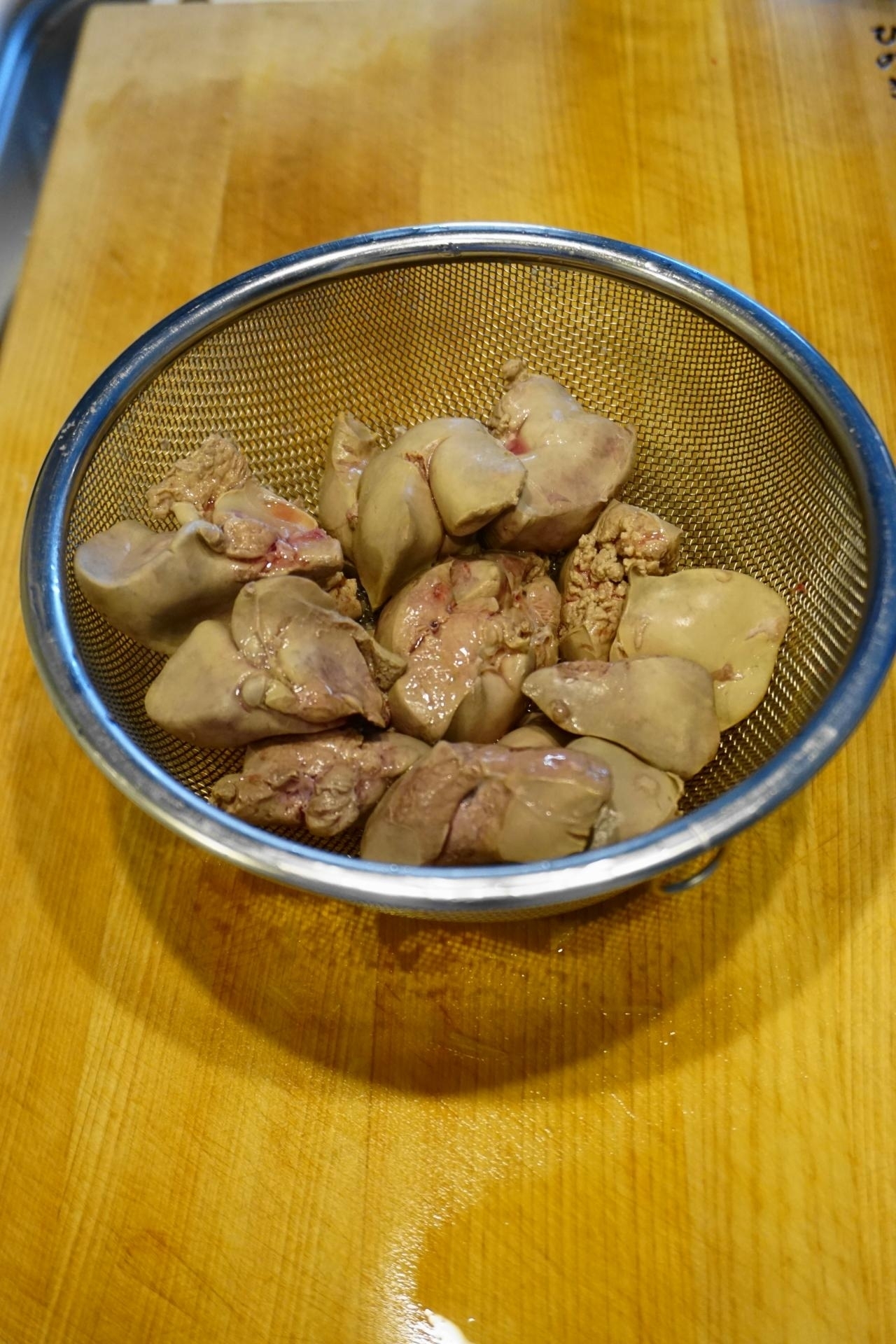 鍋に湯を沸かし2)の鶏レバーを入れ~表面の色が変わるまでサッと茹でて(霜降り)(30秒くらい)ザルに上げる。