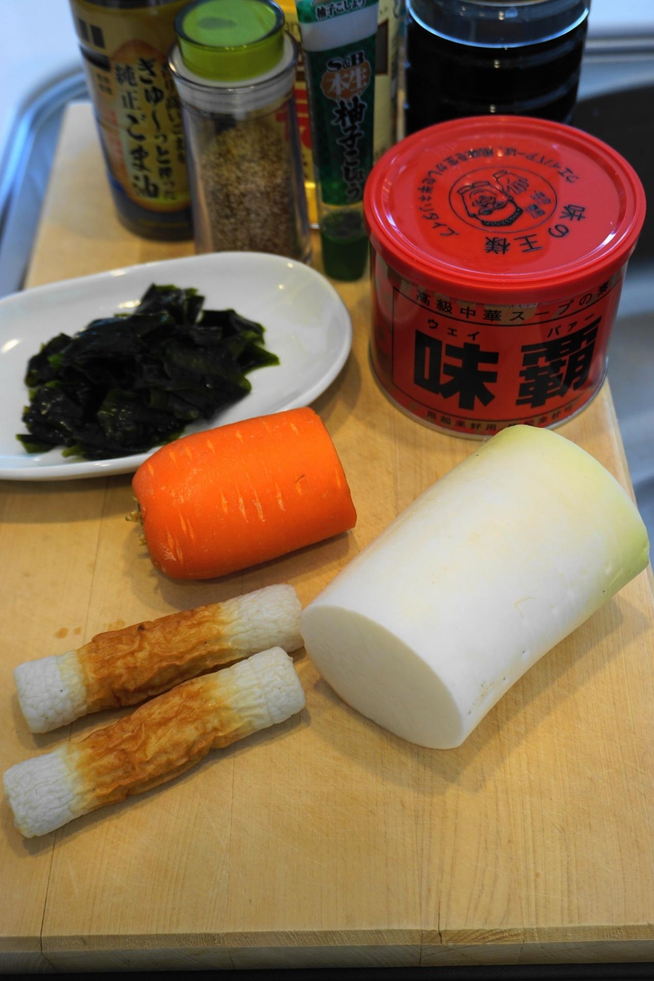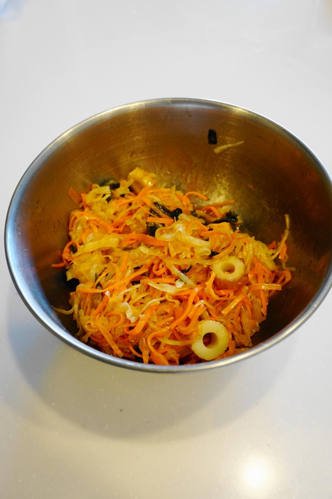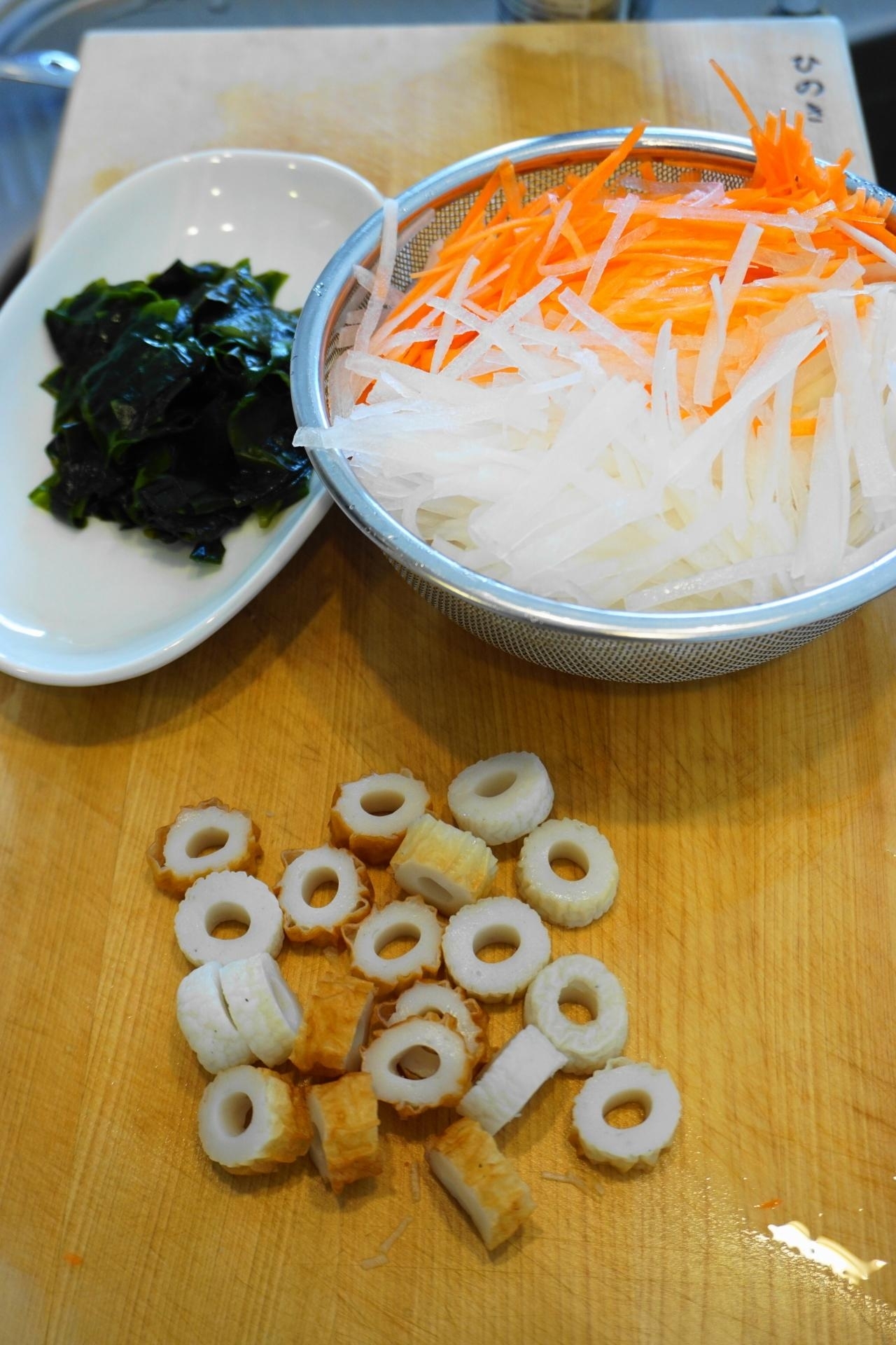 大根・人参は皮を剥き5センチ長の細切りにして(スライサーを使うと便利)~水にさらし、ワカメは茹でて4センチ幅に切り、竹輪は1センチ幅の輪切りにする。