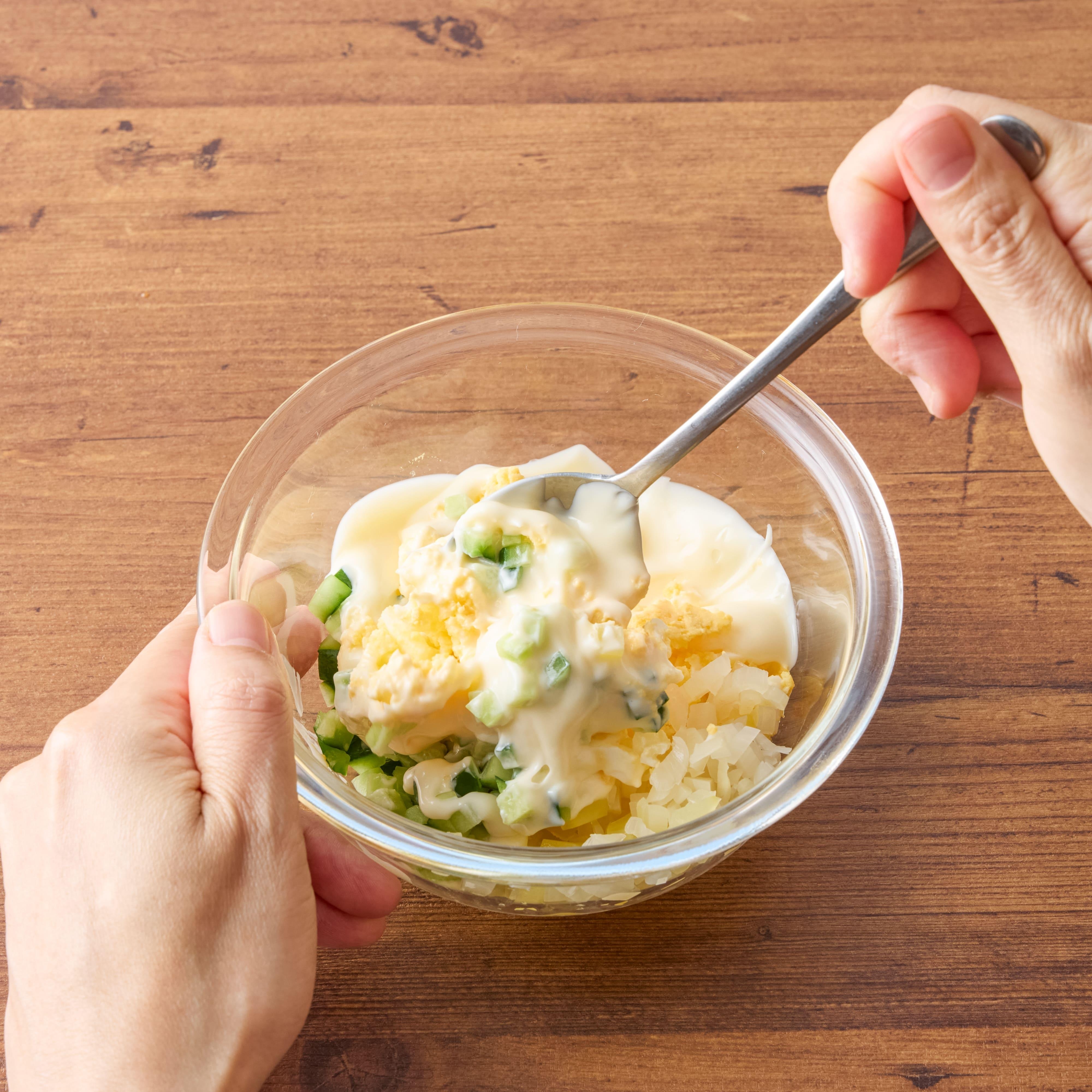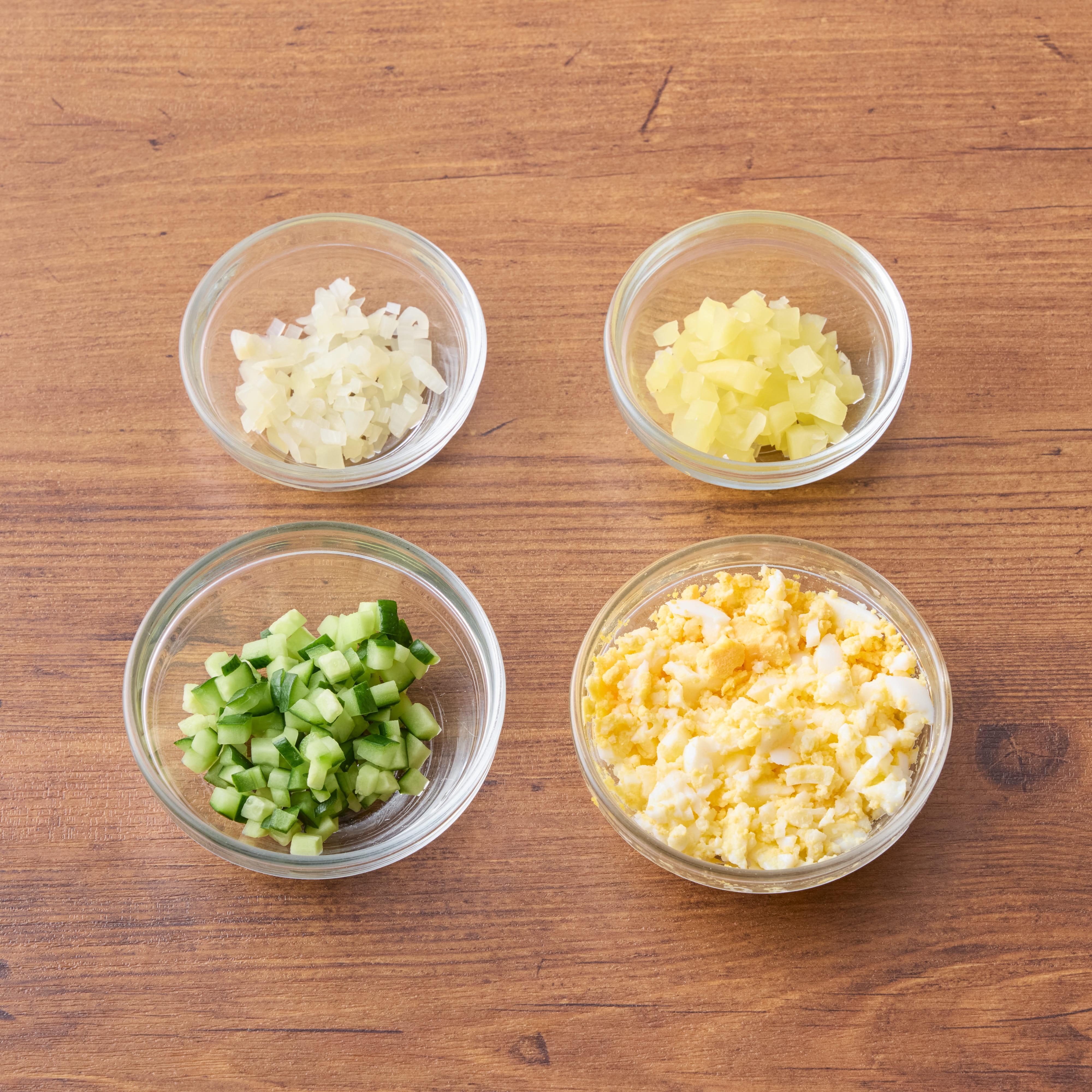 たくあんとらっきょう漬けは粗みじん切り、きゅうりは5㎜角切り、茹で卵はフォークで潰す。
