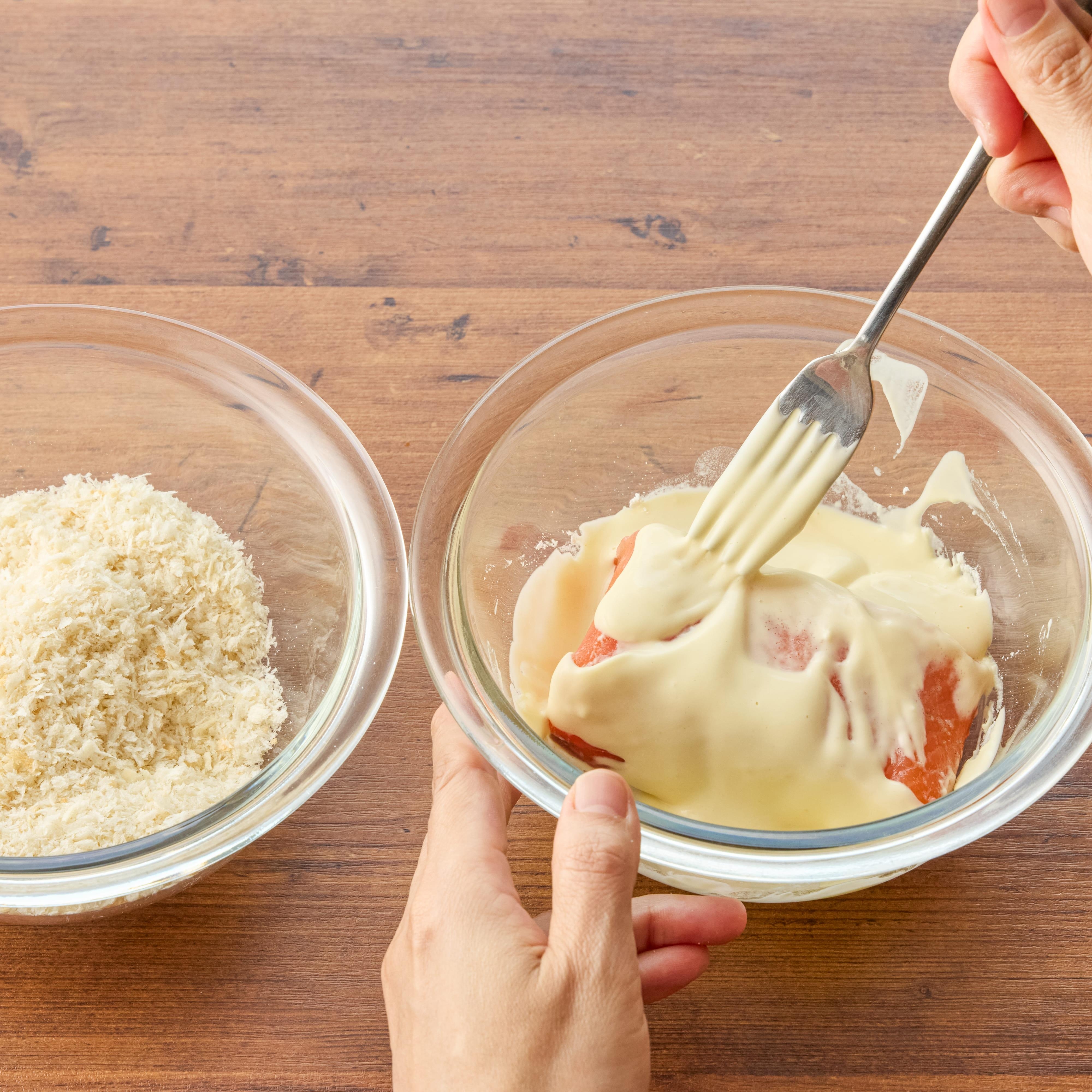 2のエンペラーサーモンに塩・こしょうをして5の衣→パン粉の順につける。