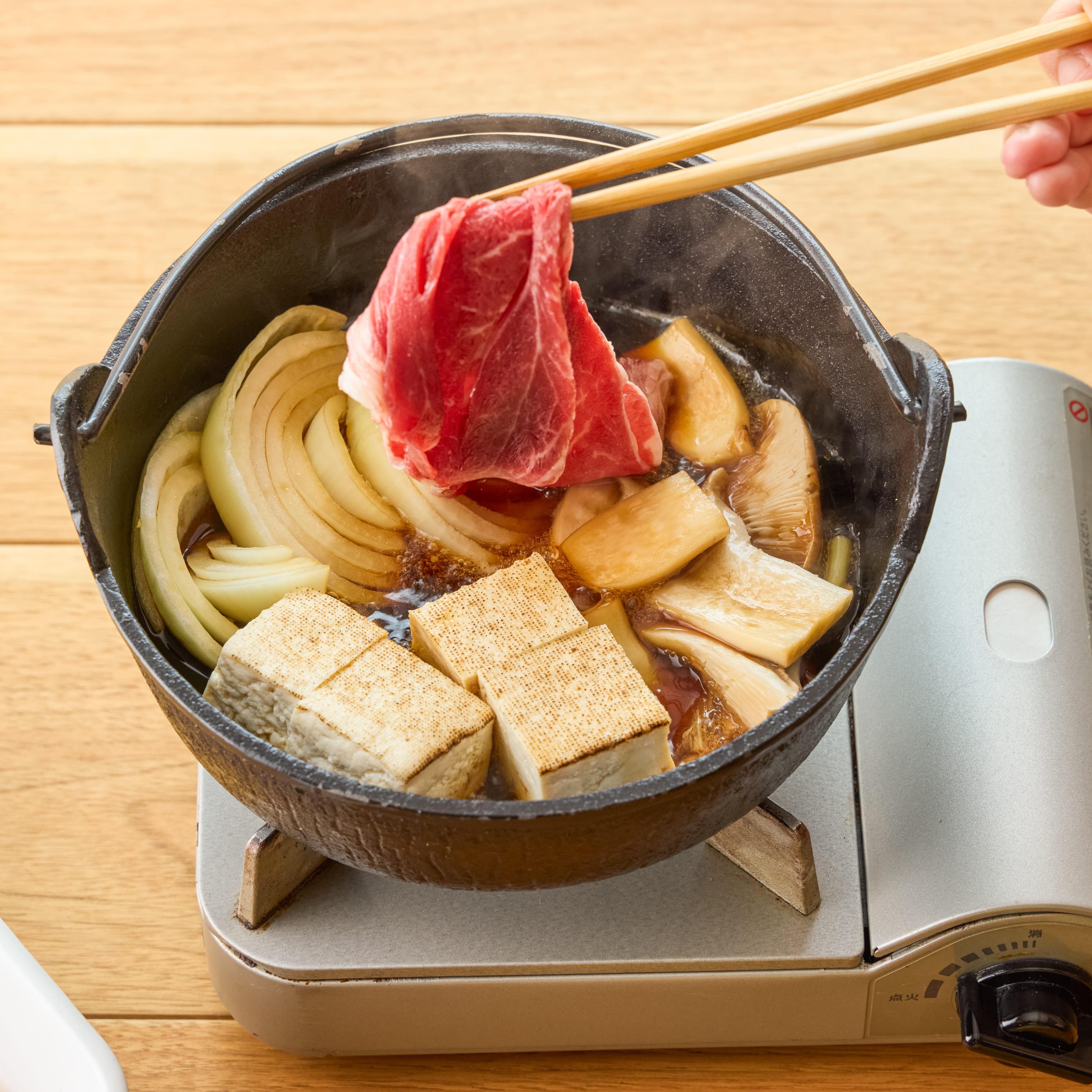 全く臭みがなく柔らかい白糠牛はすき焼きにピッタリです。トマトを加えて最後までさっぱりと召し上がれるトマトすき焼きにしてみました。お好みで溶き卵をつけてお召し上がりください。