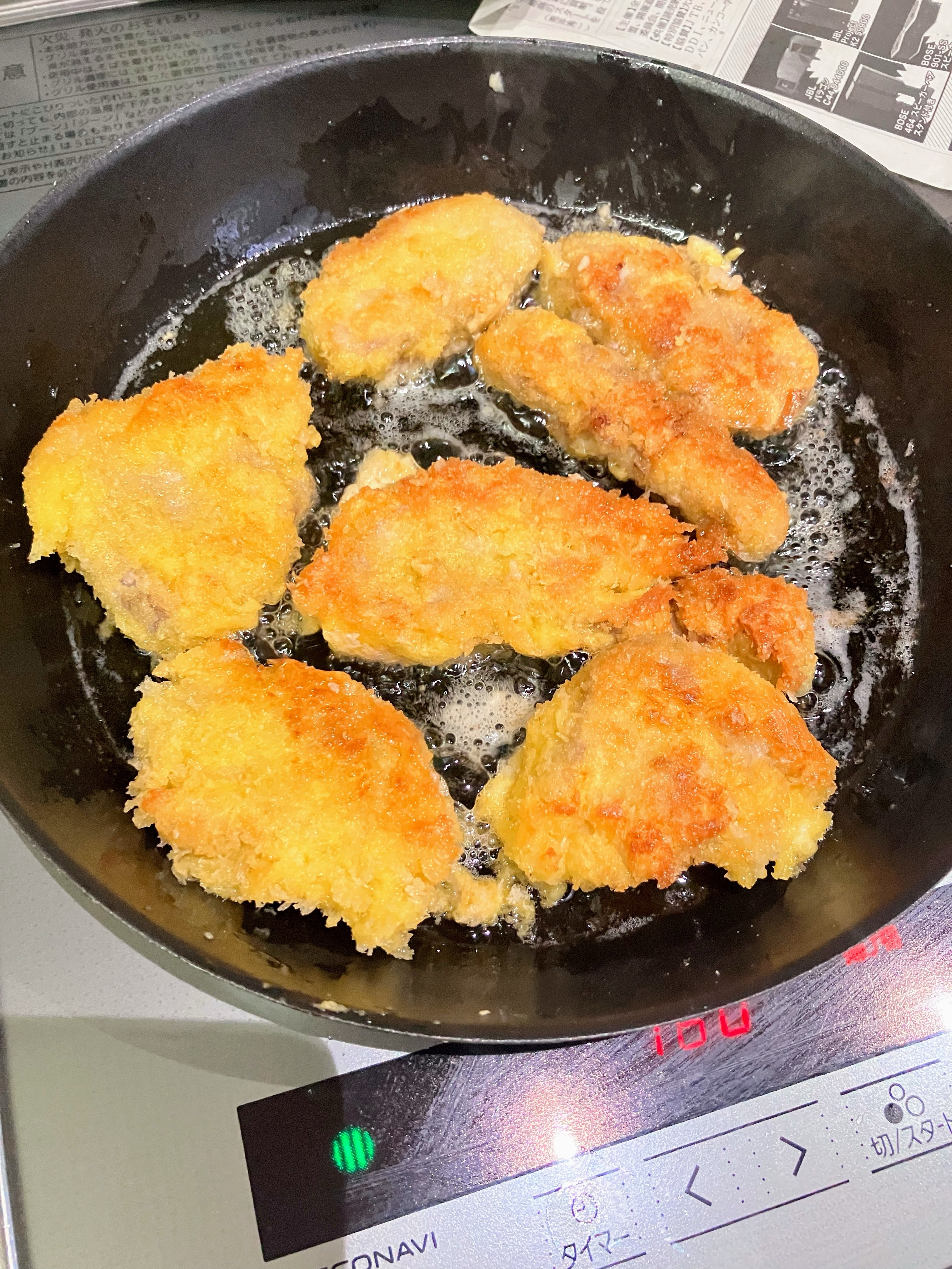 フライパンに油を入れ、160度まで熱する。(粉をつけている間に熱しておく。)