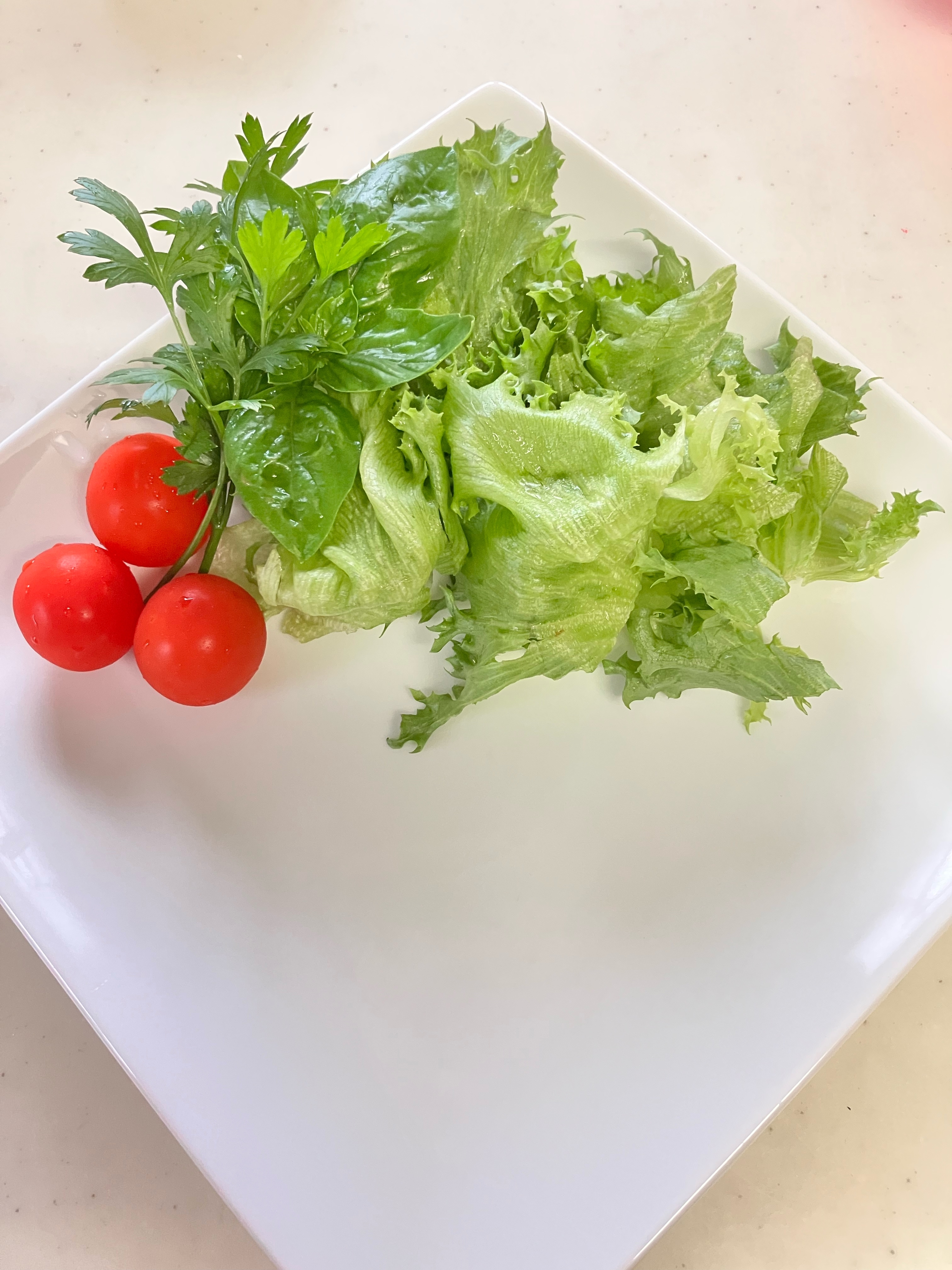揚げている間にお皿に、洗ったレタス、バジル、パセリ、ミニトマトを盛り付けておく。