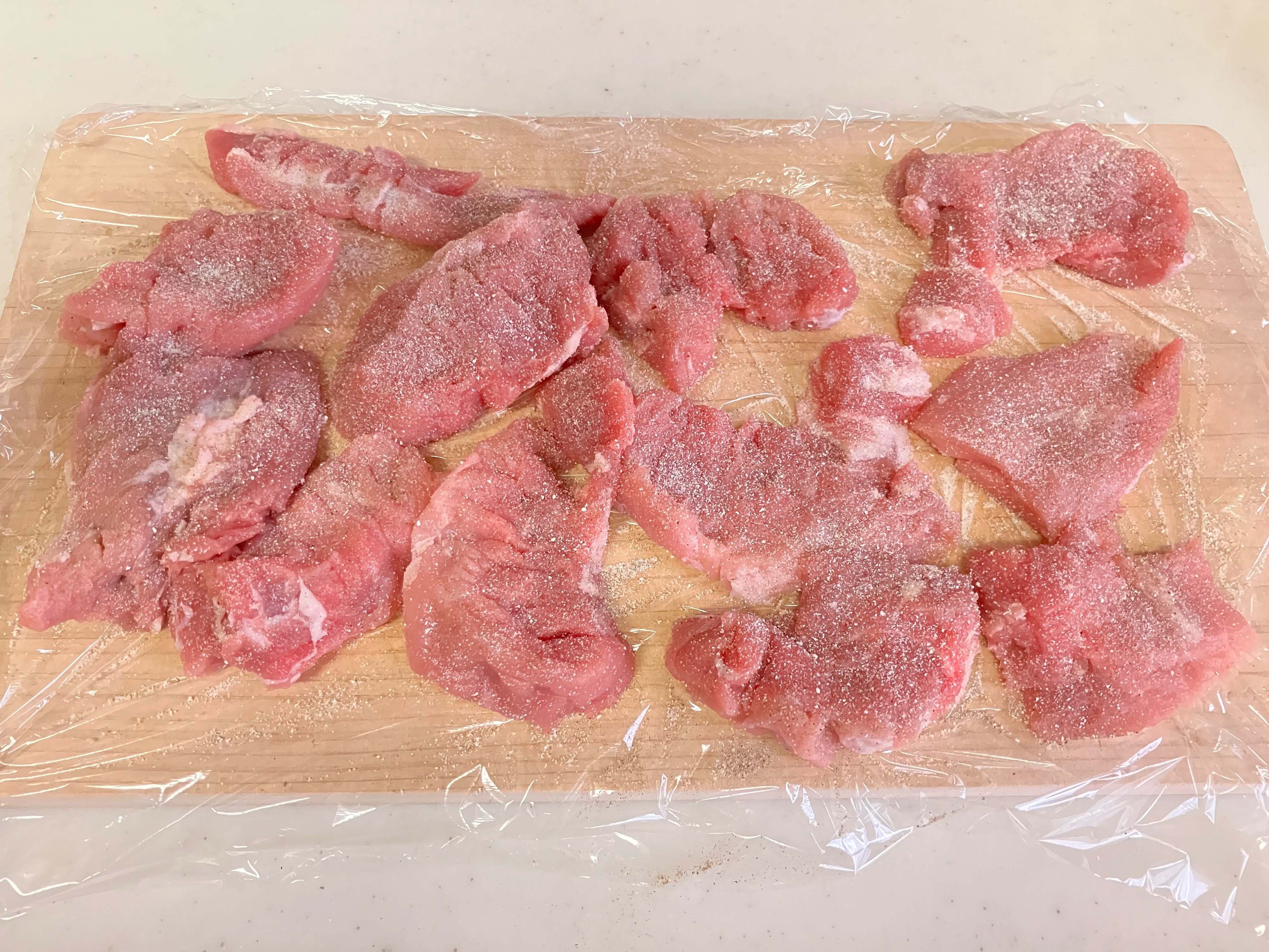 豚ブロック肉は1センチ厚さに切り、包丁の裏で叩いて少し大きく伸ばす。次に片面にだけ塩胡椒ガーリックパウダーを振る。
