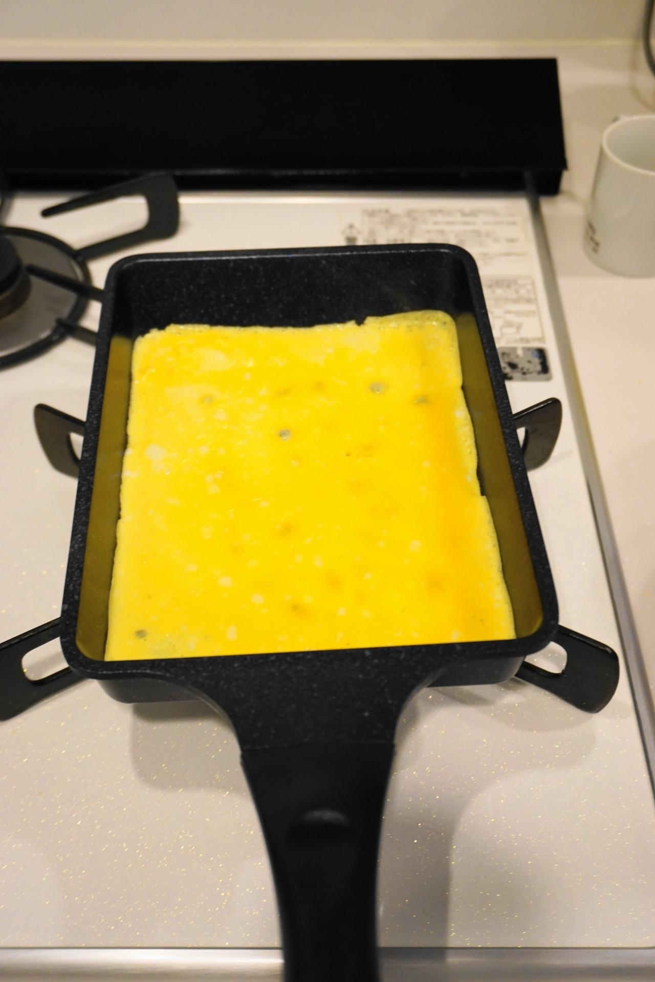 玉子焼き器にサラダ油を中火で熱し、2)の溶き卵を流し入れ薄焼き卵を作る。