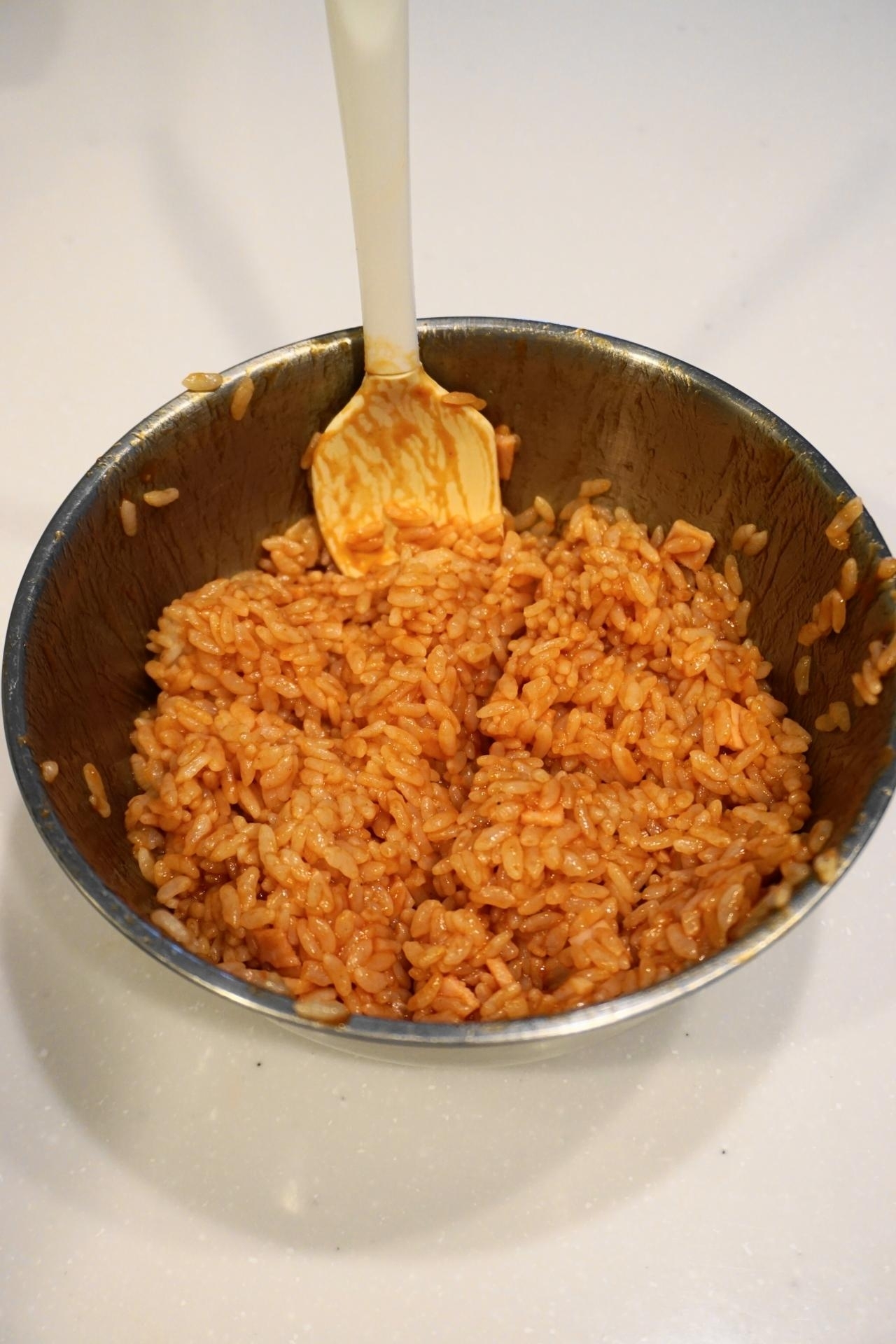 ボウルに★を入れゴムベラで切るようによく混ぜ合わせ~ご飯・2)のロースハムを加え和えて~4等分に分ける。