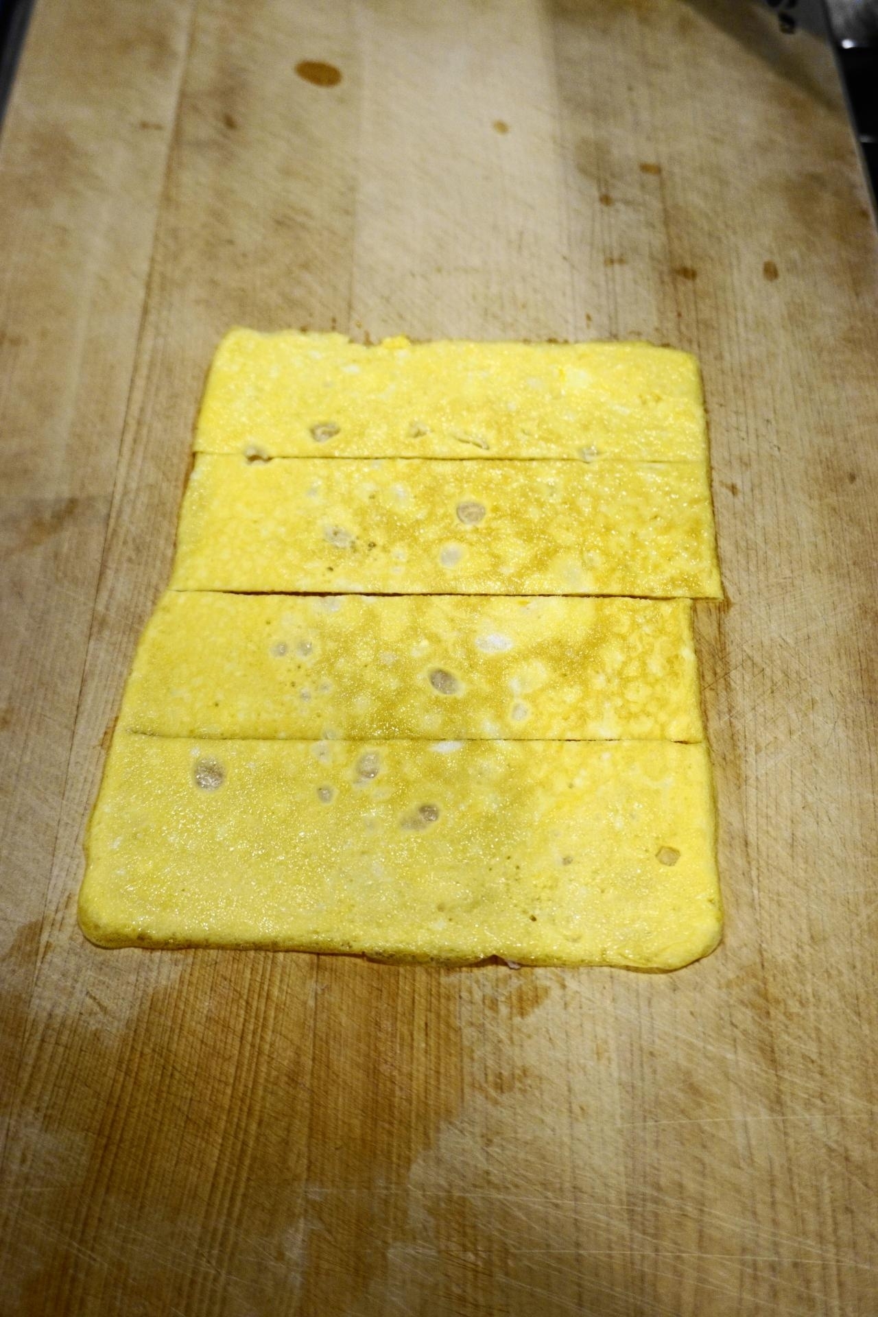 続けてまな板に移し~粗熱が取れたら帯状に4等分に切る。