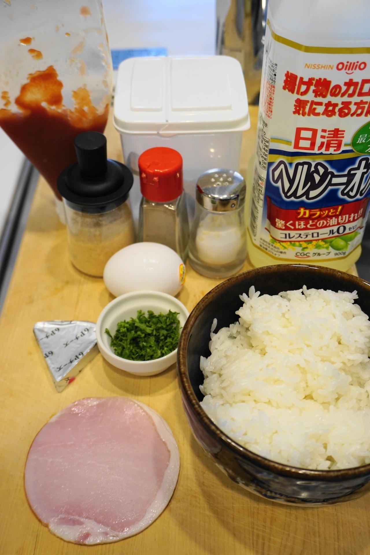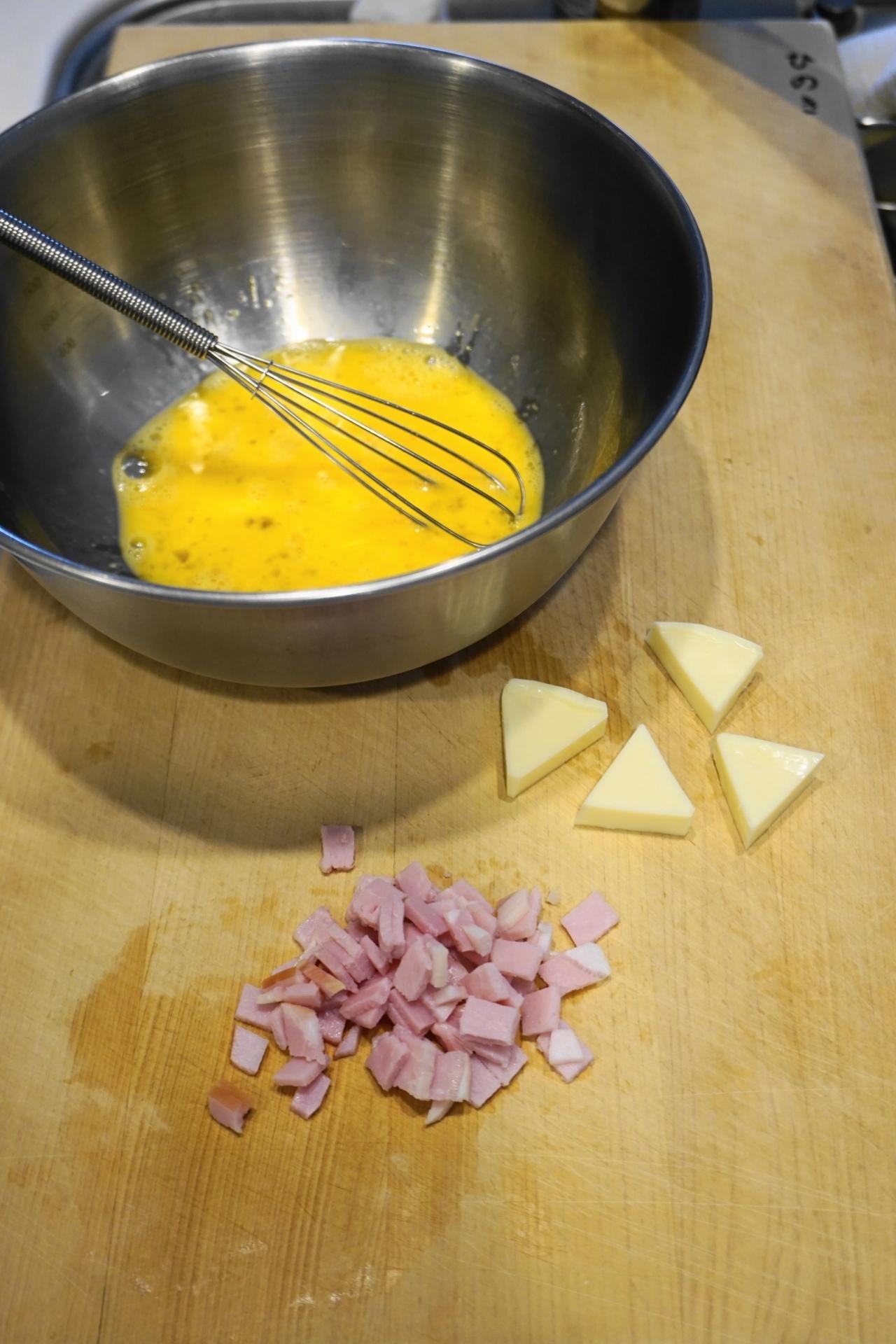 6Pチーズは4等分に切り、ロースハムは5ミリ角に切り、卵はボウルに割り入れ~塩を加えてよく溶きほぐす。