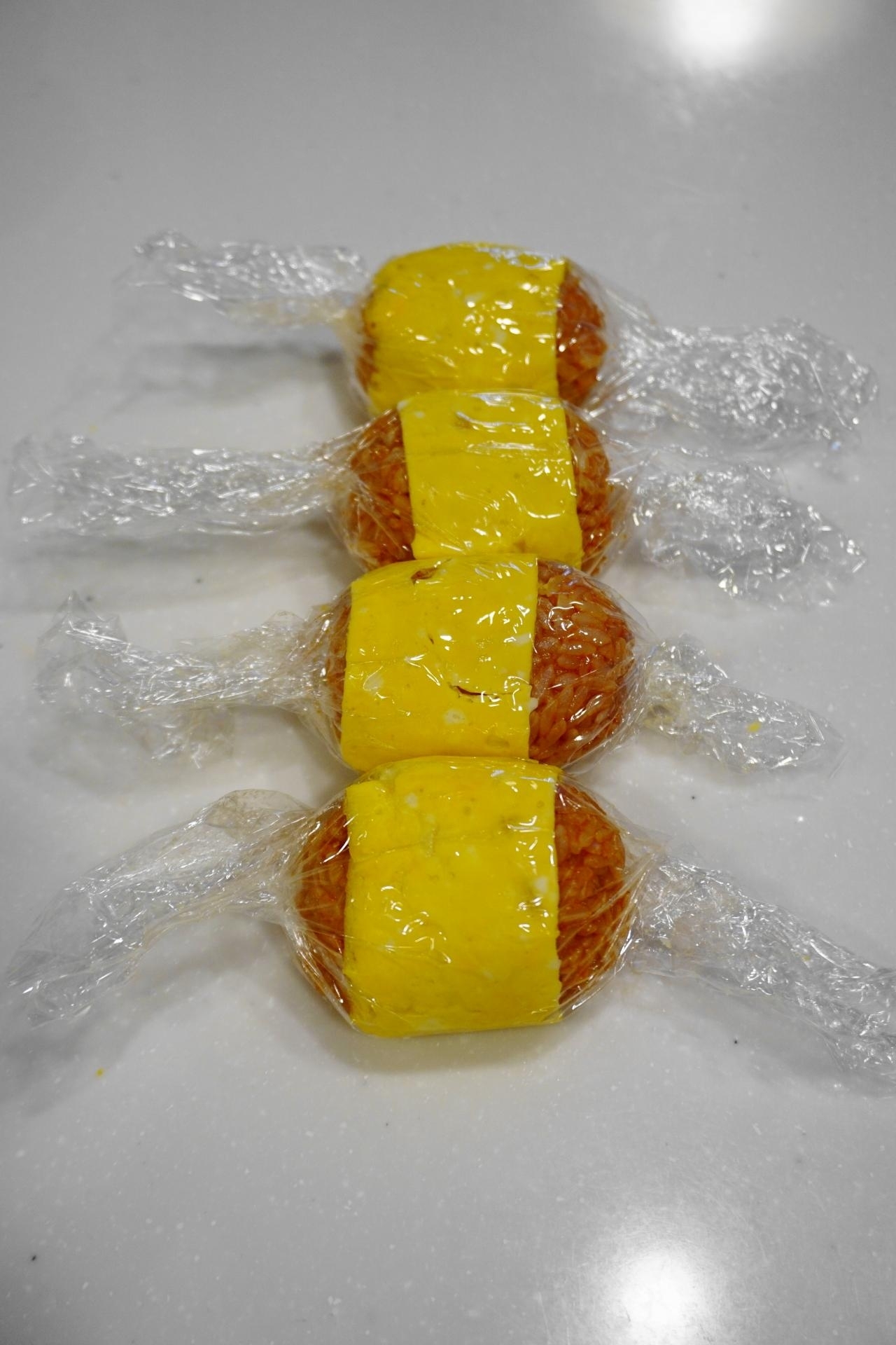 更に4)のケチャップライスおにぎりを6)の薄焼き卵を巻き~ラップで包み(キャンディー状に)暫くそのまま馴染ませる。