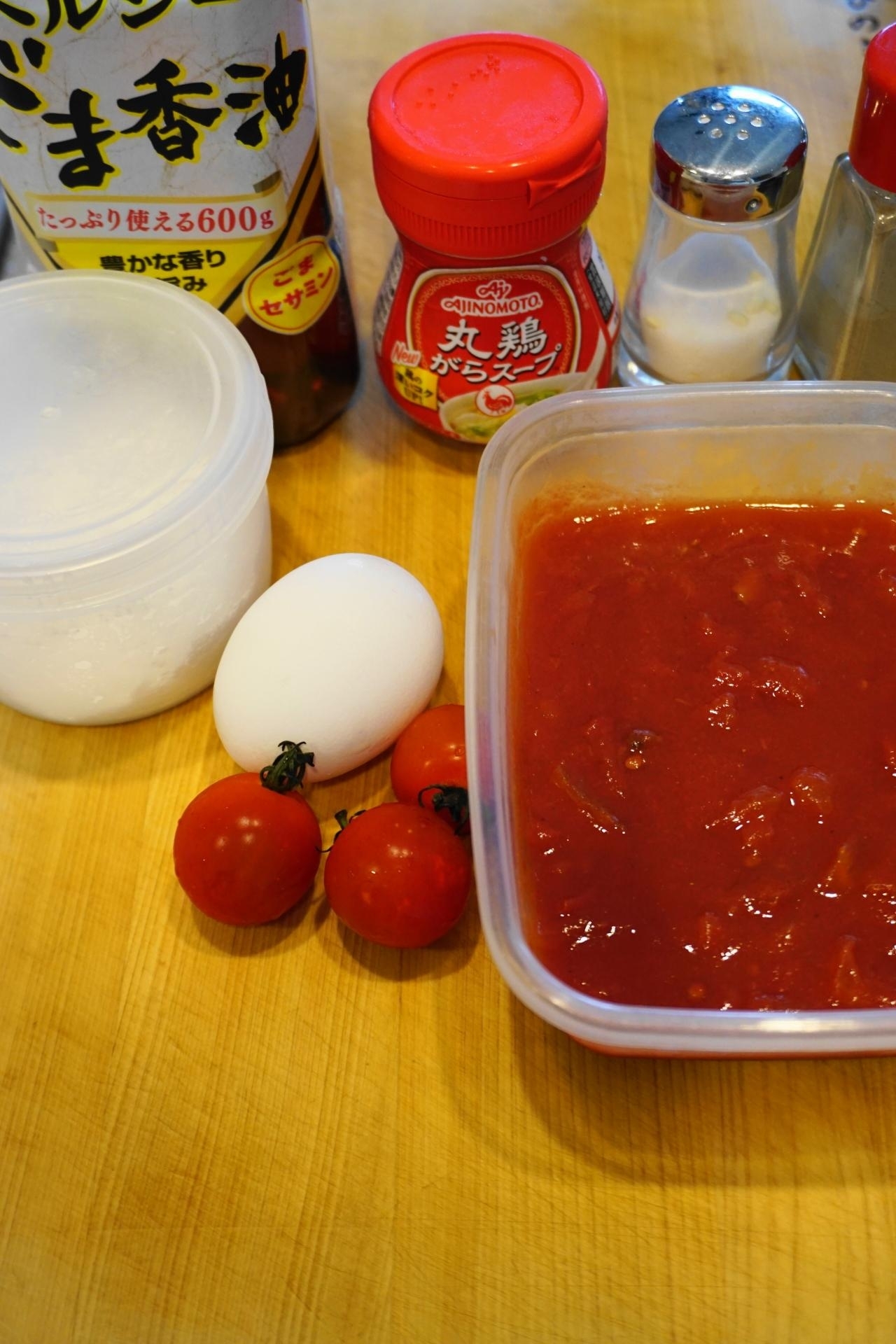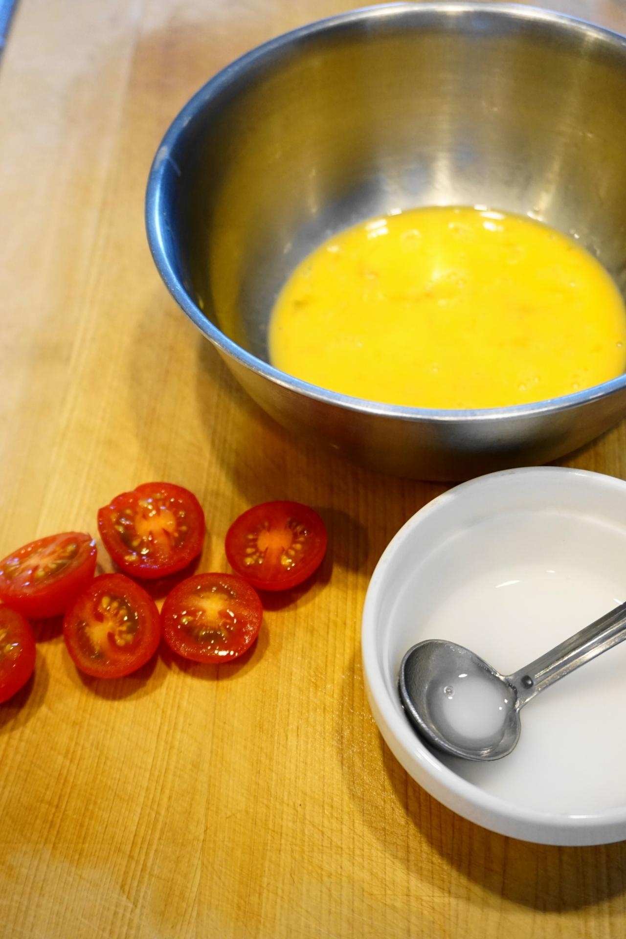 卵はボウルに割り入れ~溶きほぐし、ミニトマトはヘタを取り除き~横半分に切り、万能ねぎは小口切りにする。。