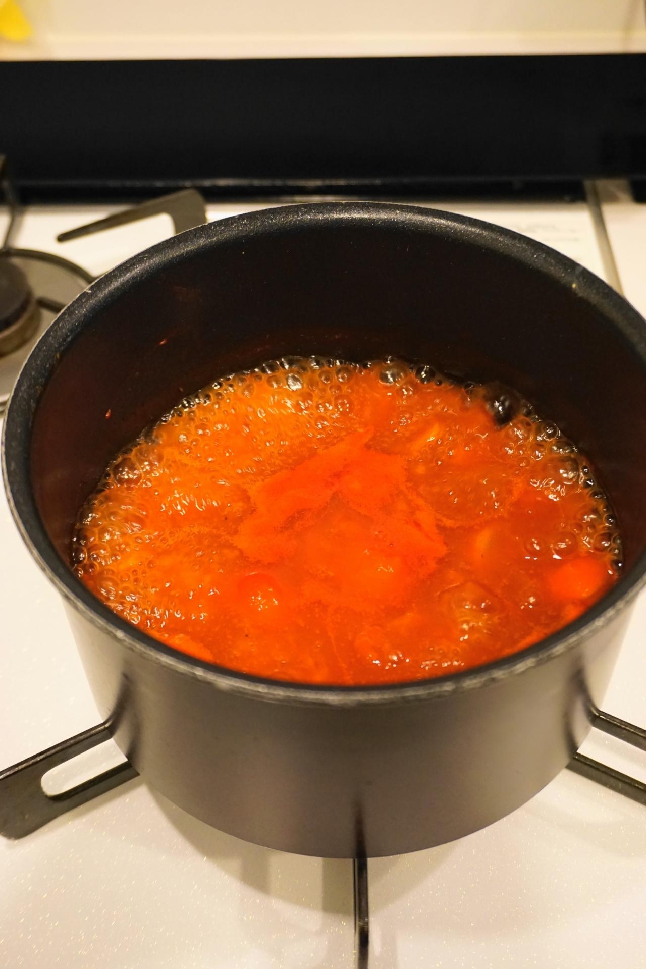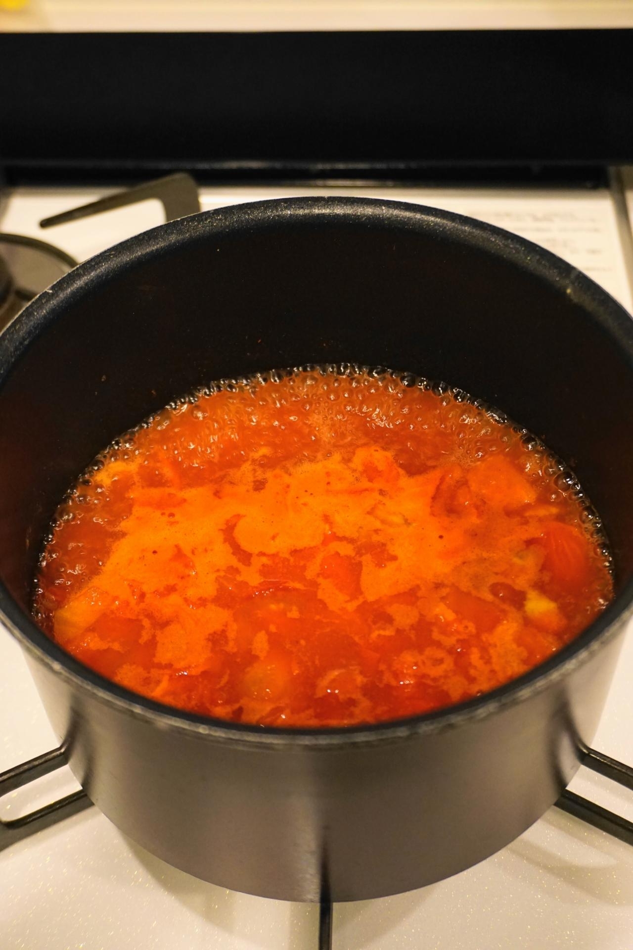 小鍋にトマト缶・★を入れ中火で熱し、沸騰したら2)のミニトマトを加えて煮る(1分くらい)。
