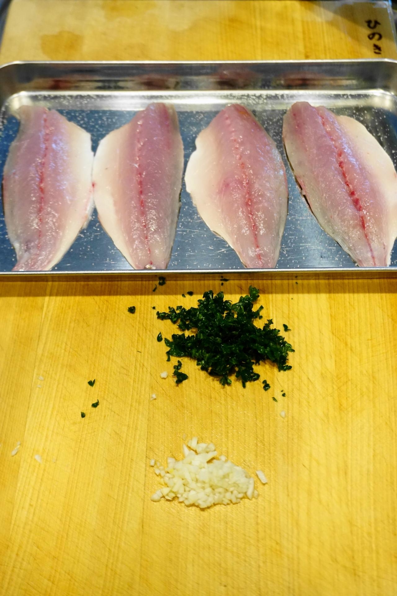 アジは小骨・ゼイコを取り除き~両面に塩をふり置き(10分くらい)~キッチンペーパーで水気を拭き取り、ニンニク・パセリはみじん切りにする。