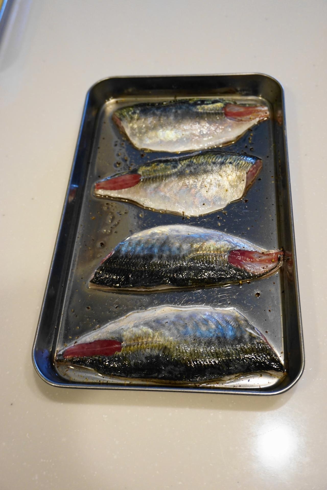 フライパンにオリーブオイルを中弱火で熱し、5)のアジを並べ入れ(皮目を下にして)~コンガリ焼き色が付くまで両面を焼く(焦げないように注意して~各面1分30秒くらいずつ)。