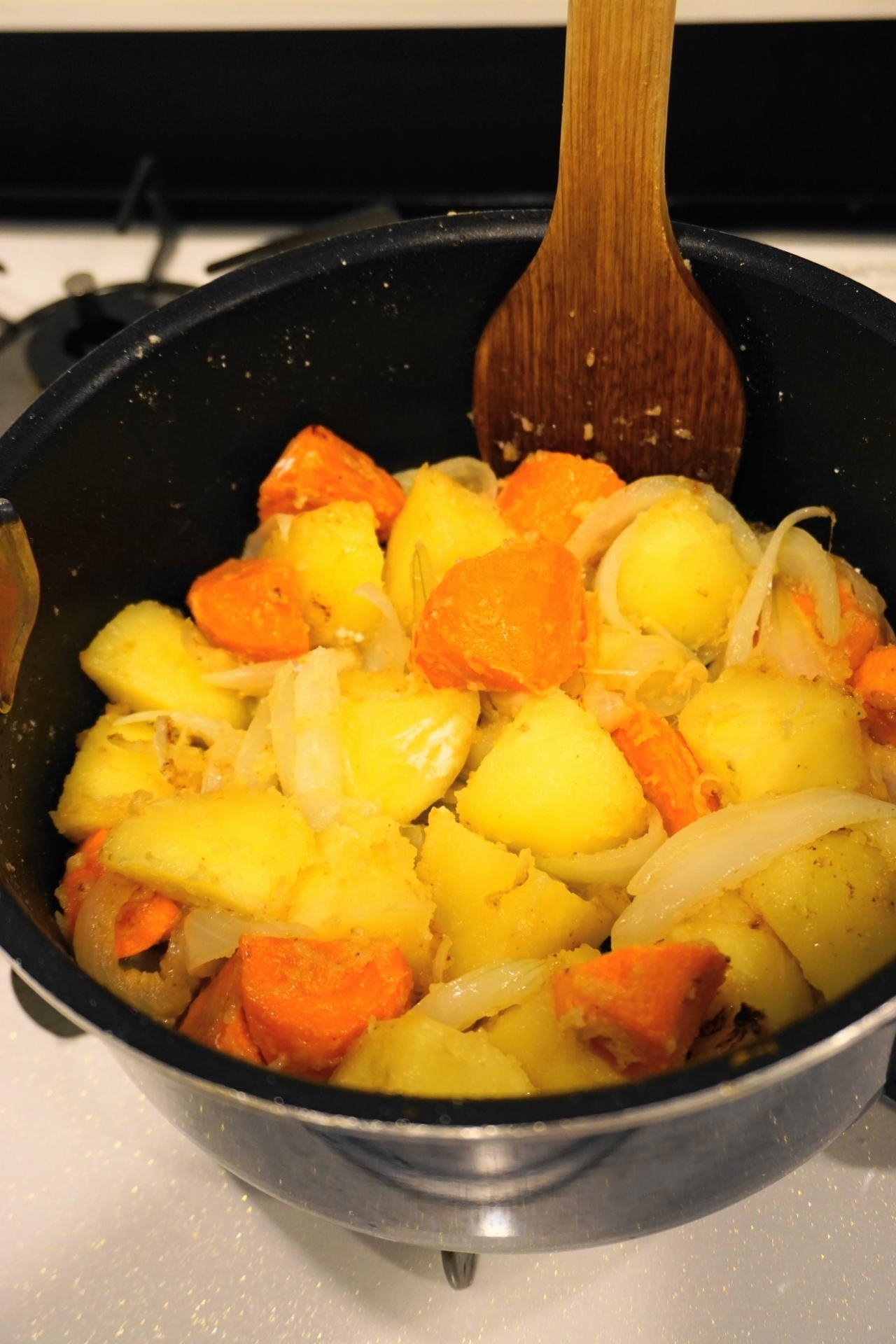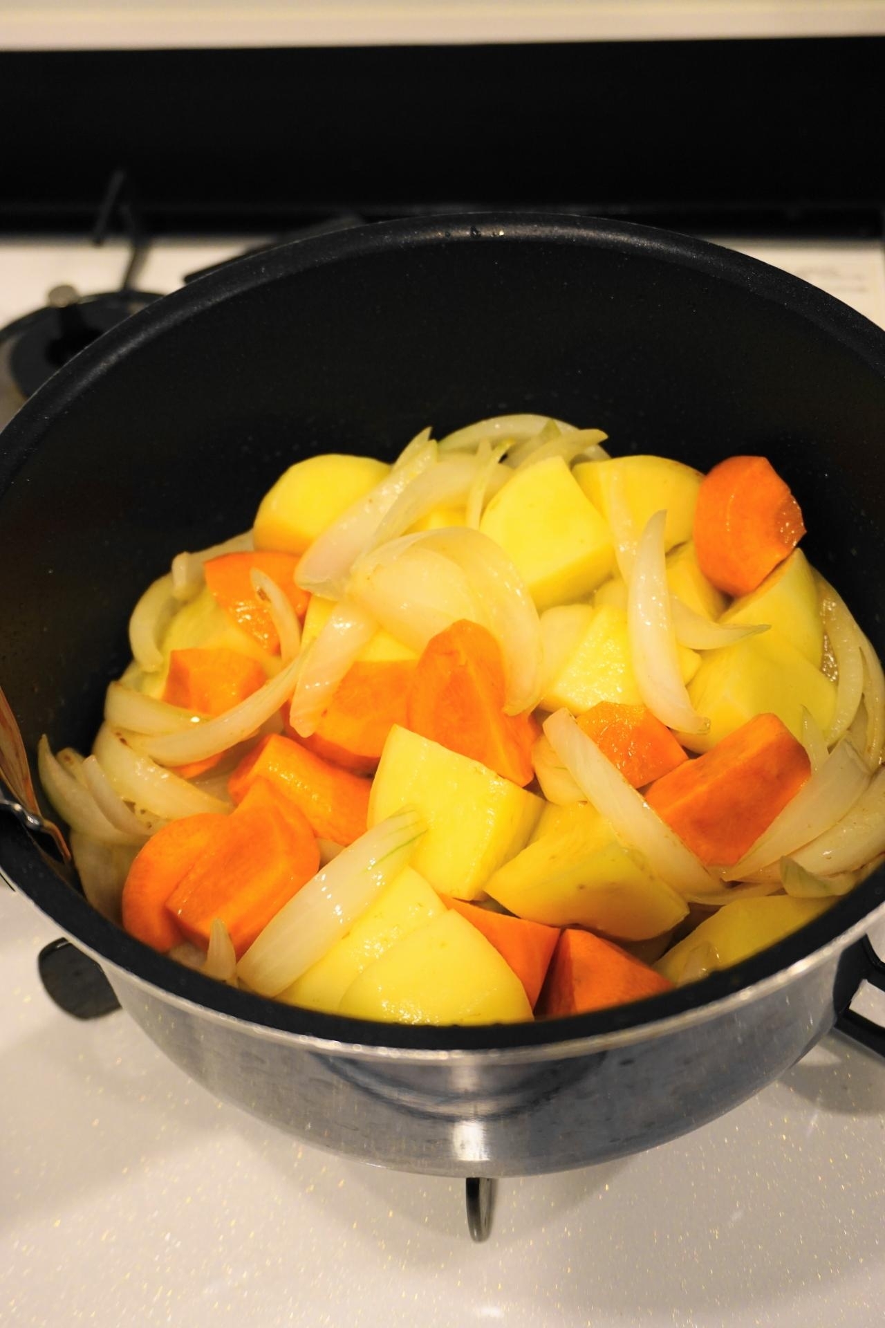 続けて同じ鍋にバターを中火で熱し、2)の玉ねぎ・じゃがいも・ニンジンの順に入れ~それぞれ全体に油が回るまで炒める。