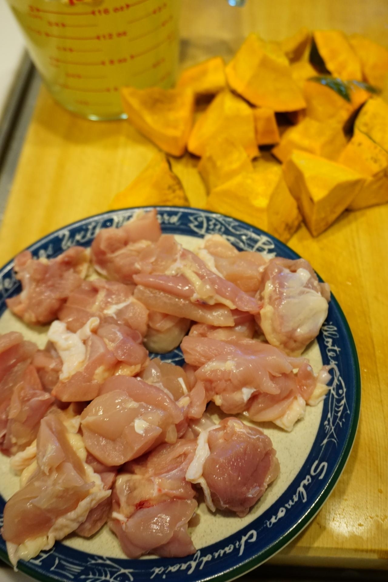 鶏もも肉は余分な脂・筋を取り除き一口大に切り~塩・胡椒をふり下味を付け~小麦粉をまんべんなくまぶし(焼く直前に)、カボチャは種・ワタを取り除き~ひと口大に切る。