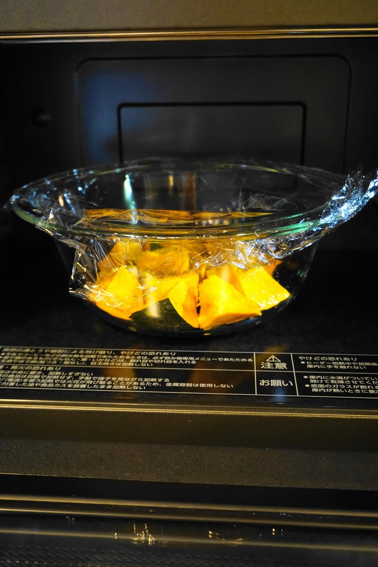 耐熱容器に3)のカボチャを並べ入れ~ラップをフンワリとかけ電子レンジで柔らかくなるまで加熱して(600wで5分くらい)~マッシャーなどで滑らかになるまで潰す。