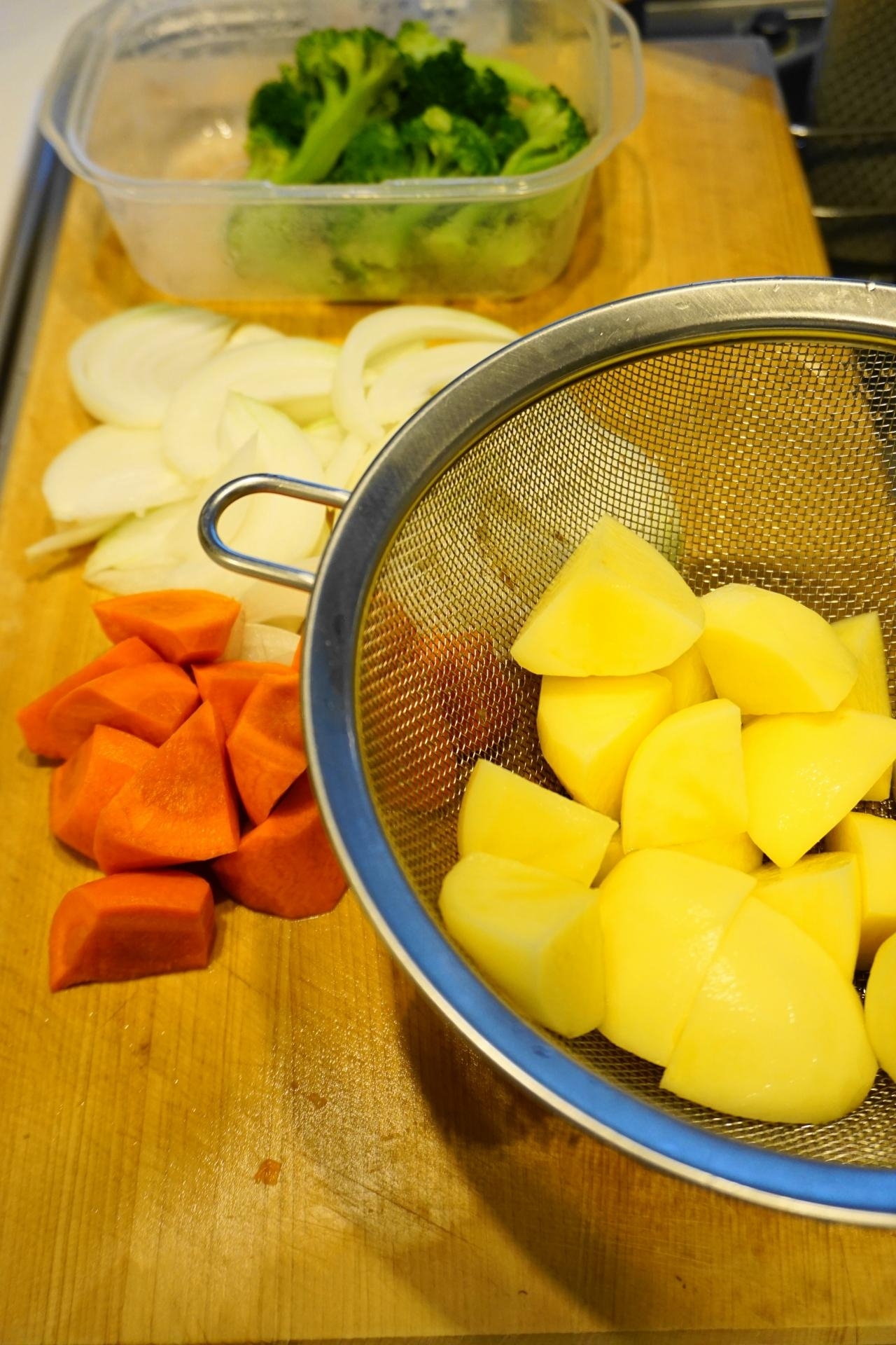 じゃがいもは皮を剥き一口大に切り~水にさらし置き(5分くらい)、玉ねぎは1センチ幅のくし切りに、ニンジンは皮を剥き乱切りに、ブロッコリーは小房に分け~色よく塩茹でする。