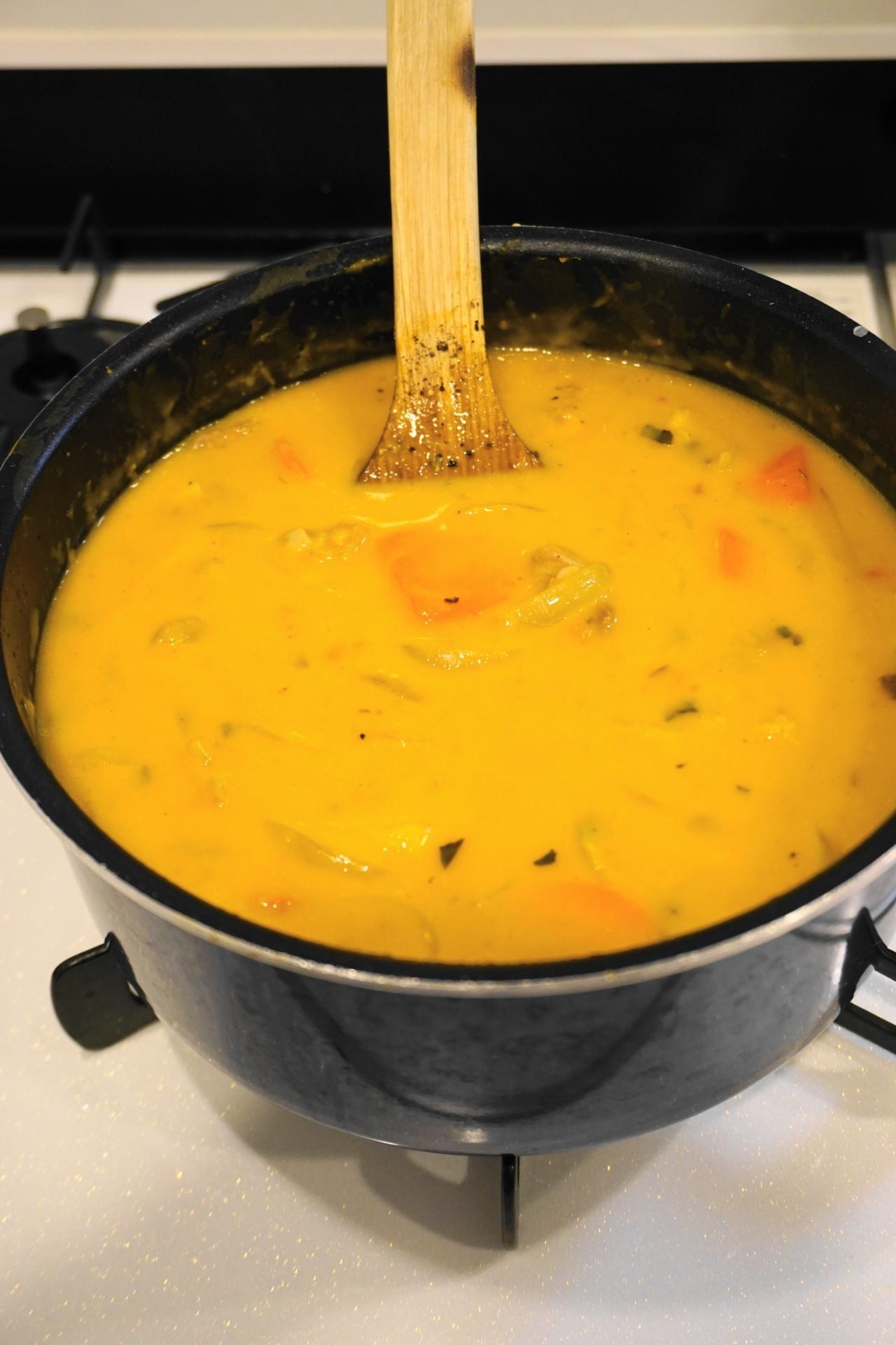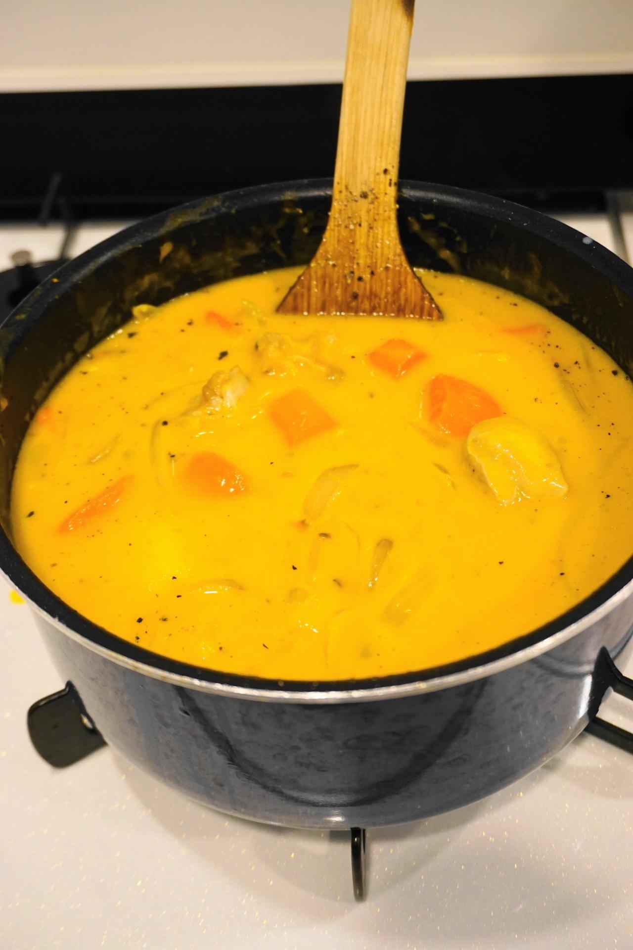 更に牛乳・4)のカボチャを入れカボチャを溶かすように混ぜ合わせ~5)の鶏もも肉を戻し入れ沸騰しないように弱火で煮込み(5分くらい)~塩・胡椒で味を調える。