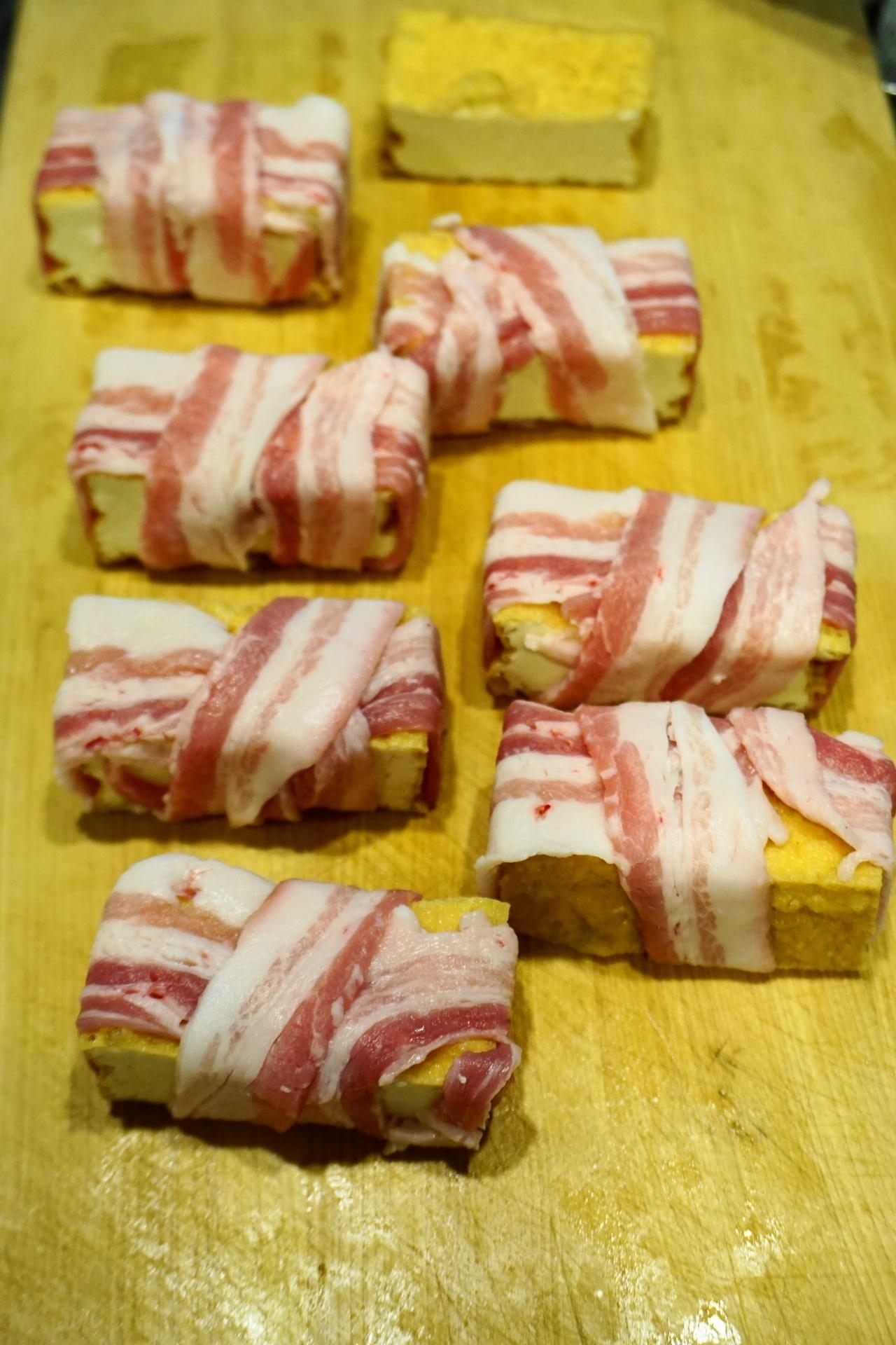 2)の厚揚げに豚バラ肉を巻き付け(半分巻いたら~途中で角度を変えて残りの半分を巻く)(キュッときつめに巻き~最後に手でギュッと握る)~両面に塩・胡椒をふり小麦粉をまぶす。