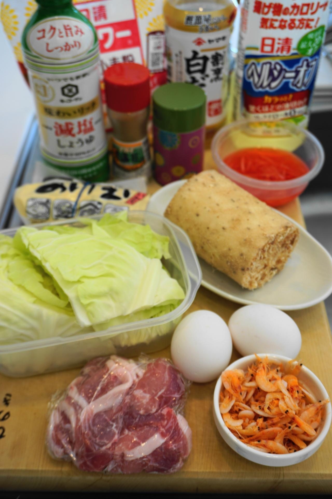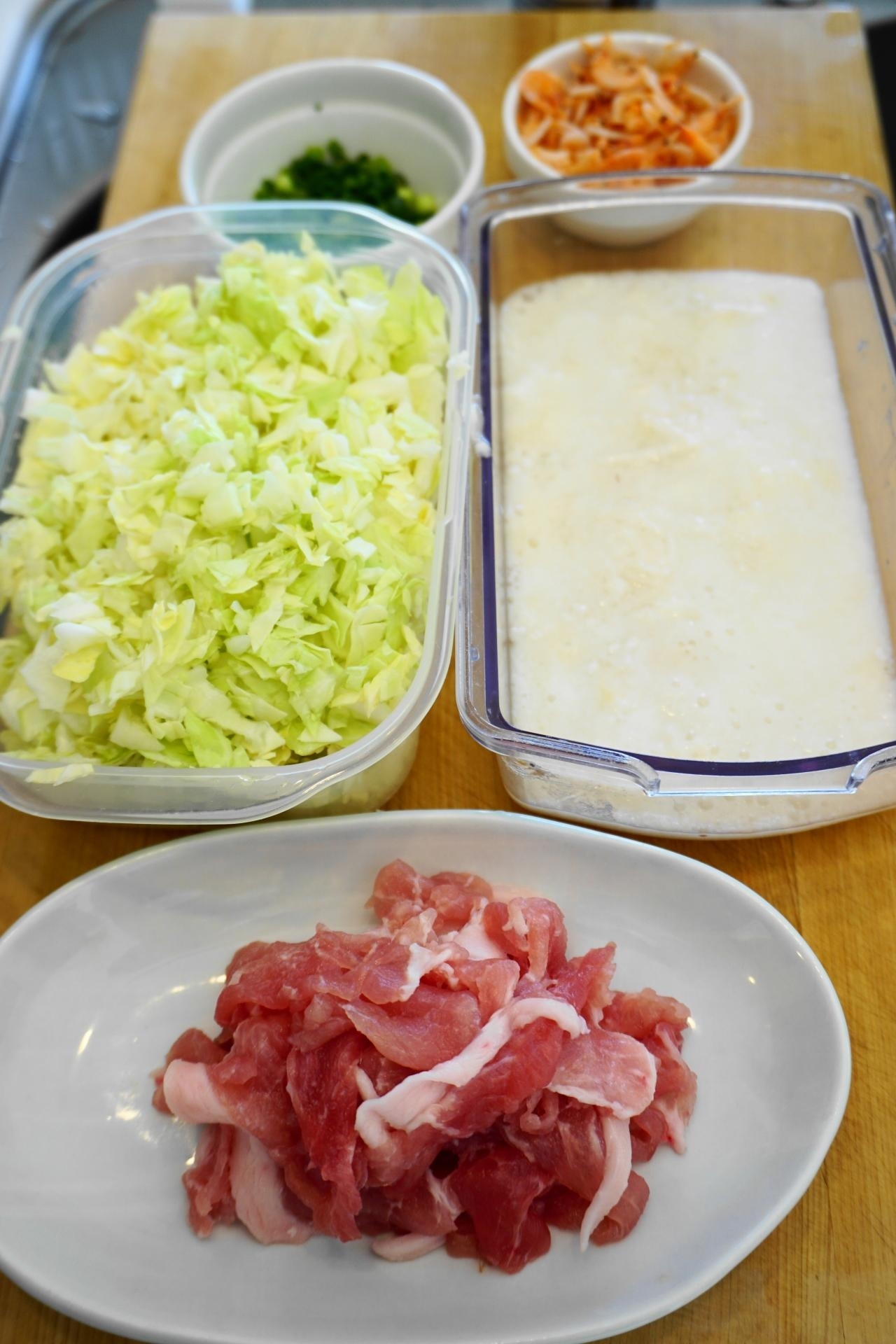 豚肉は食べやすい大きさに切り、キャベツは芯を取り除き~粗みじん切りに、長いもは皮を剥き~摺りおろし、万能ねぎは小口切りにする。