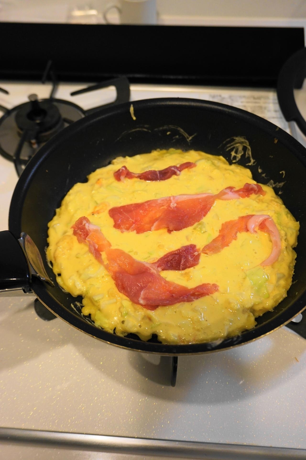 小さめのフライパンにサラダ油を中火で熱し、4)の生地(1/3量)を流し入れ平らに均し~2)の豚肉(1/3量)を広げのせる。
