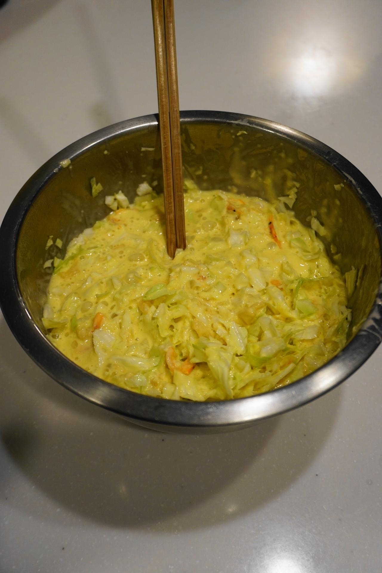 続けて☆・2)のキャベツを入れ~底から空気を含ませているように菜箸でザックリと混ぜる(焼く直前に)。