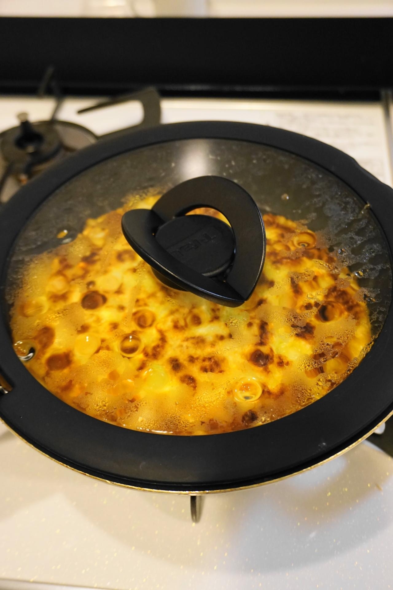 続けて焼き色が付くまで焼き(4分くらい)~裏返して竹串で穴を開け(10ヵ所くらい)蓋をして中弱火で焼く(5分くらい)。