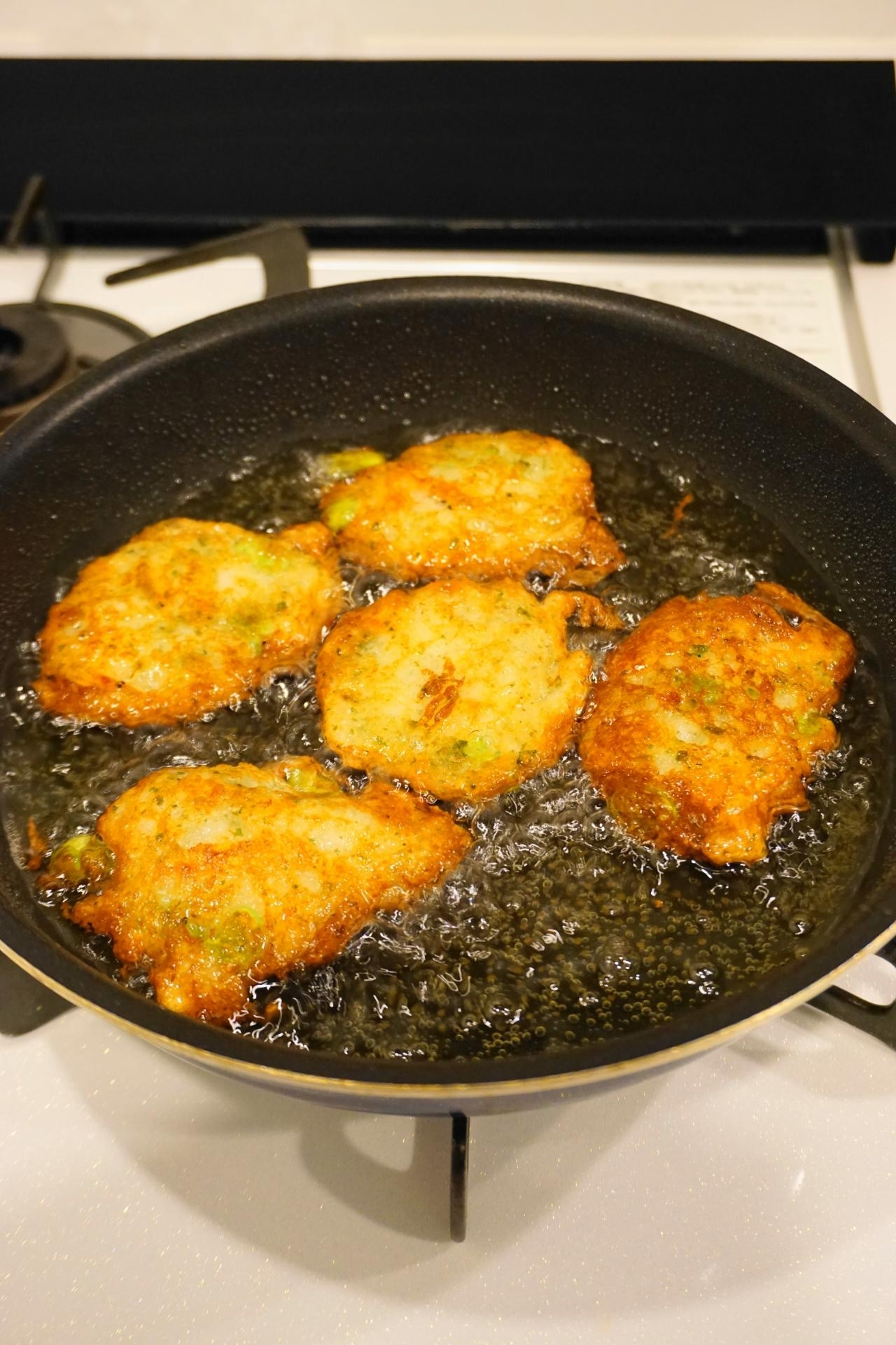 小さめのフライパンに揚げ油(深さ1センチくらい)を中火で熱し(180℃くらい)、3)の種★をスプーンでひと口大にすくい落とし入れる(種が重ならないように)(今回は2回に分けて)。
