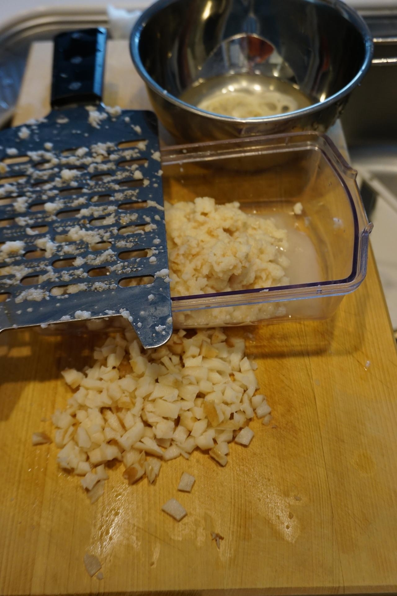 レンコンは皮を剝き~極薄切り(飾り用に2枚)にして~残りを摺り下ろし(3/4量)ザルに入れ水気を切り&5ミリ角の粗みじん切り(1/4量)にする。