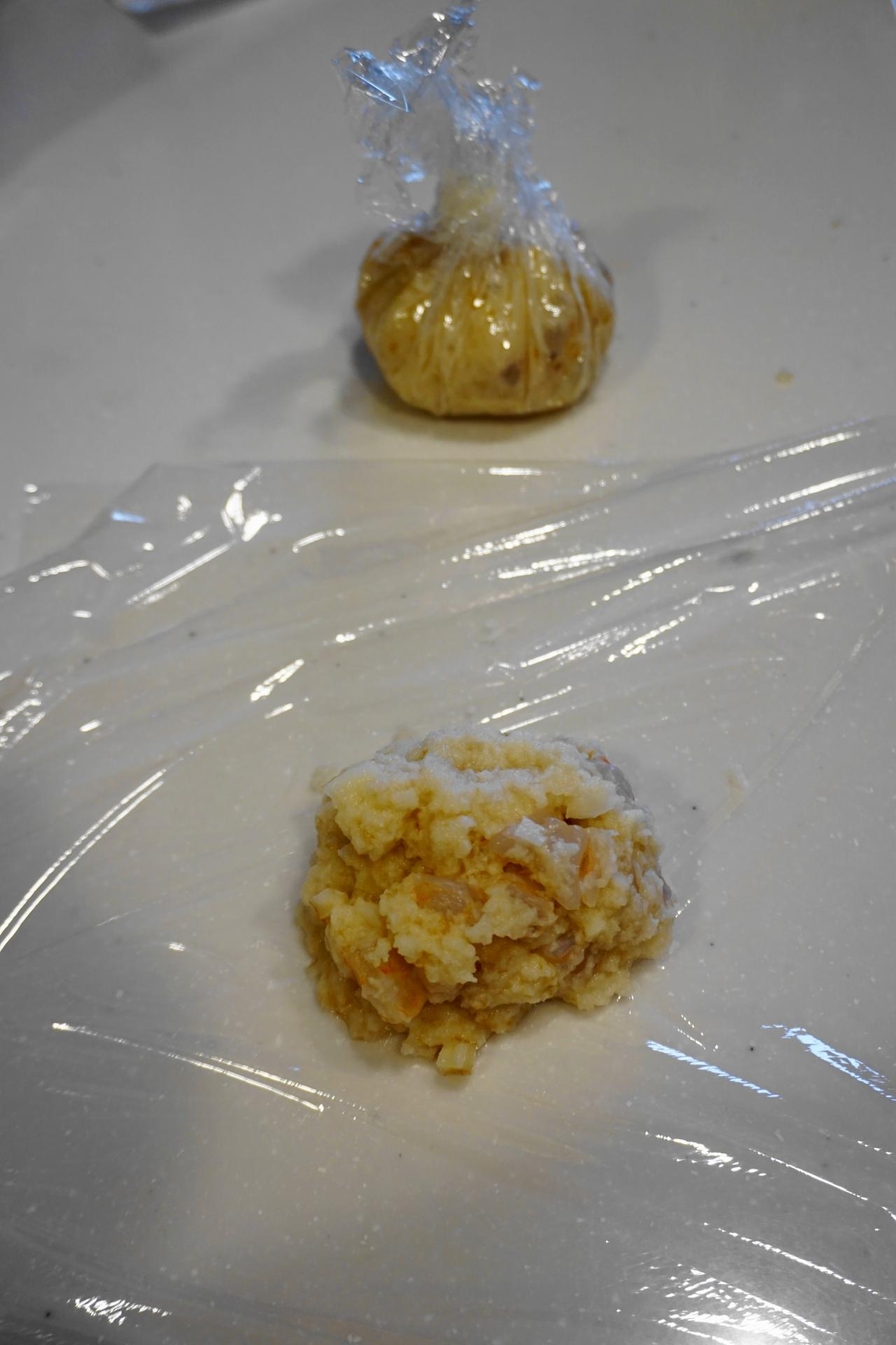 続けてラップを広げ置き~その上に4)のまんじゅう種をのせて~巾着のように絞り成形する(同様にもう1個も作る)。