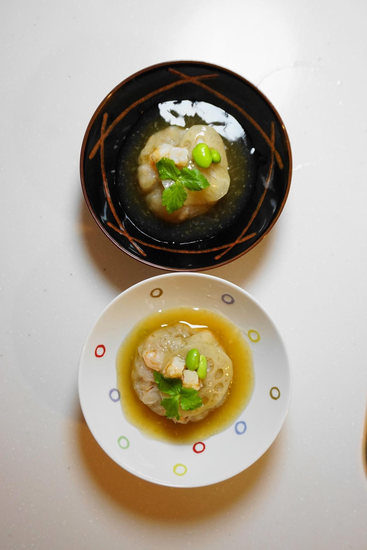 最後に器に6)の蓮根まんじゅうを盛り、7)の餡をかけ~7)のレンコン(飾り用)・海老(飾り用)・お好みで三つ葉・枝豆を添えて完成。