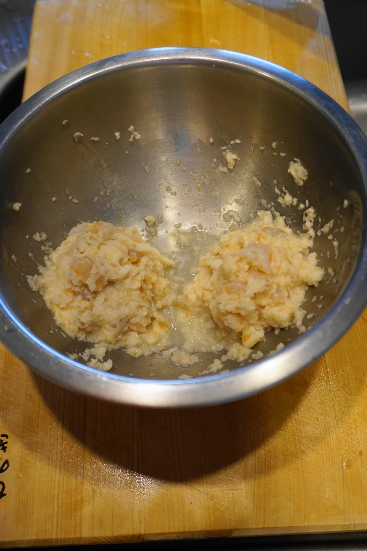 ボウルに2)のレンコン(摺り下ろし・粗みじん切り)・3)の海老(飾り用に4粒残しておく)・片栗粉・塩・和風だしの素を入れ~粘りが出るまで混ぜ合わせ2等分にする。