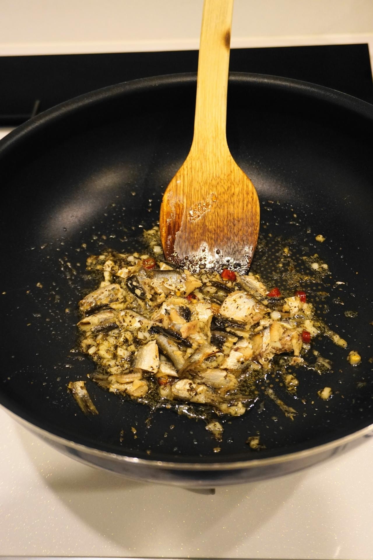 フライパンに3)のオイルサーディンのオイル・ニンニク・★を入れ中弱火で熱し、香りが立ったら3)の赤唐辛子・鰯を加えて(トッピング用に3切れ残して)粗く崩しながらザッと炒める。