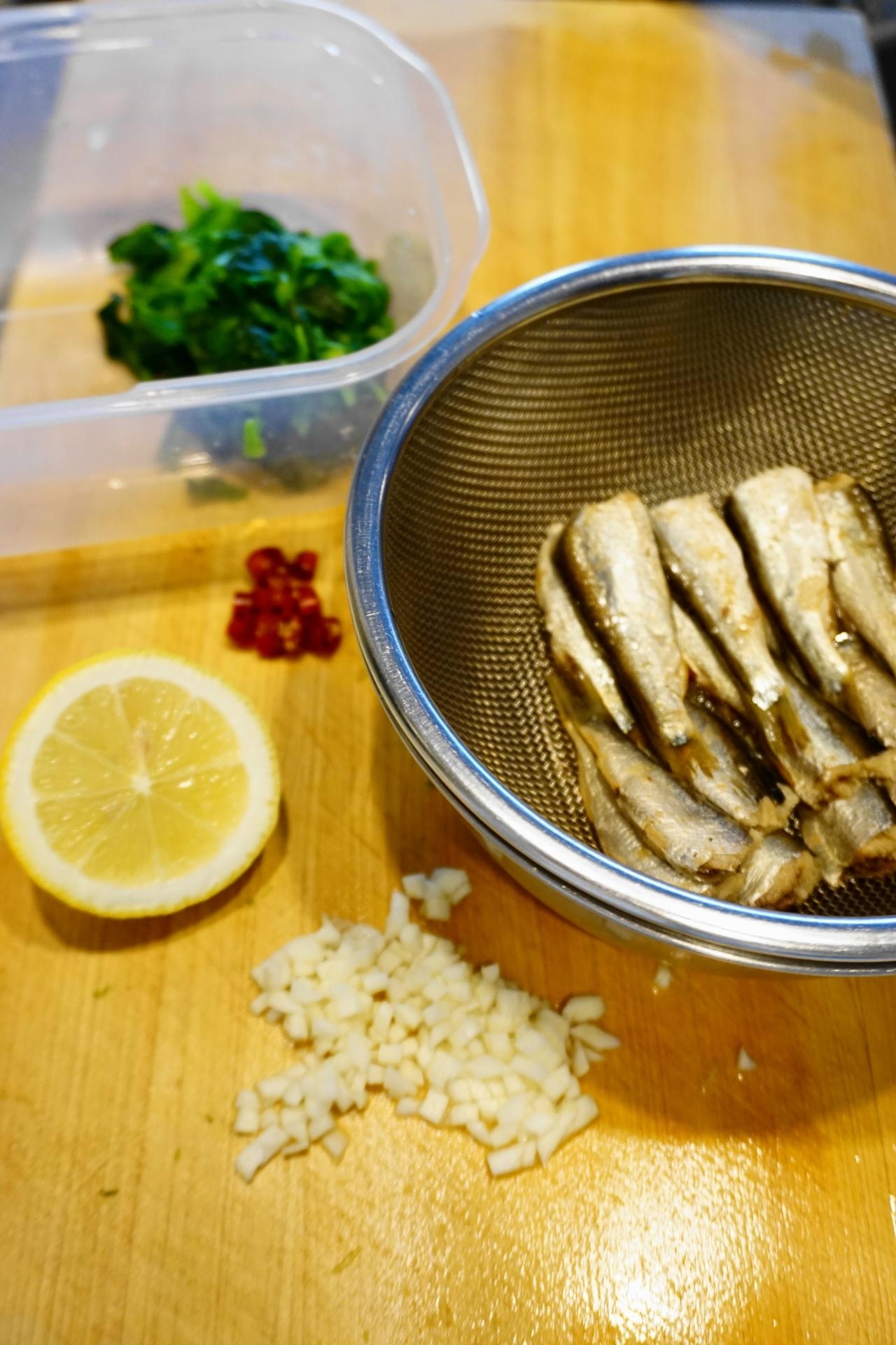 2)のほうれん草の根元を切り落とし~1センチ幅に切り水気を手で絞り、オイルサーディンはオイルと鰯に分け、赤唐辛子はヘタ・種を取り除き~小口切りに、ニンニクはみじん切りにする。