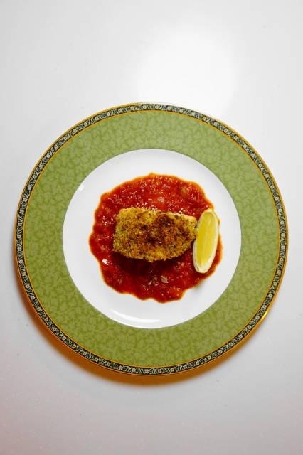 最後に器に7)のトマトソース・6)のサーモンを盛り、お好みでレモンを添えて完成。
