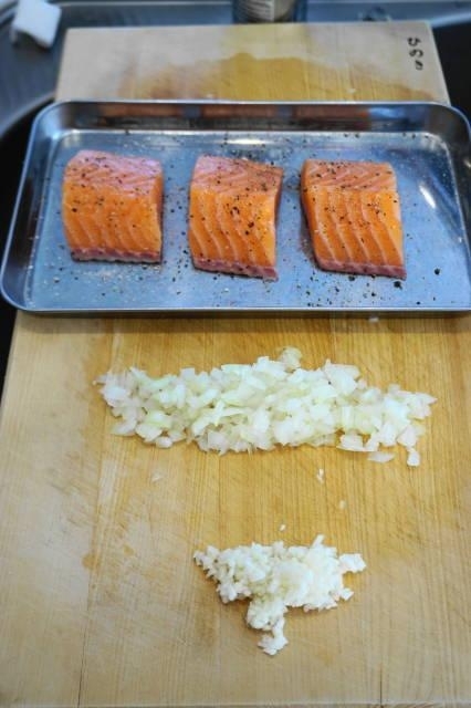サーモンは横3等分に切り~両面に塩・黒胡椒をふりおき(10分くらい)~キッチンペーパーで水気を拭き取り、ニンニクは芽を取り除き~みじん切りに、玉ねぎはみじん切にする。