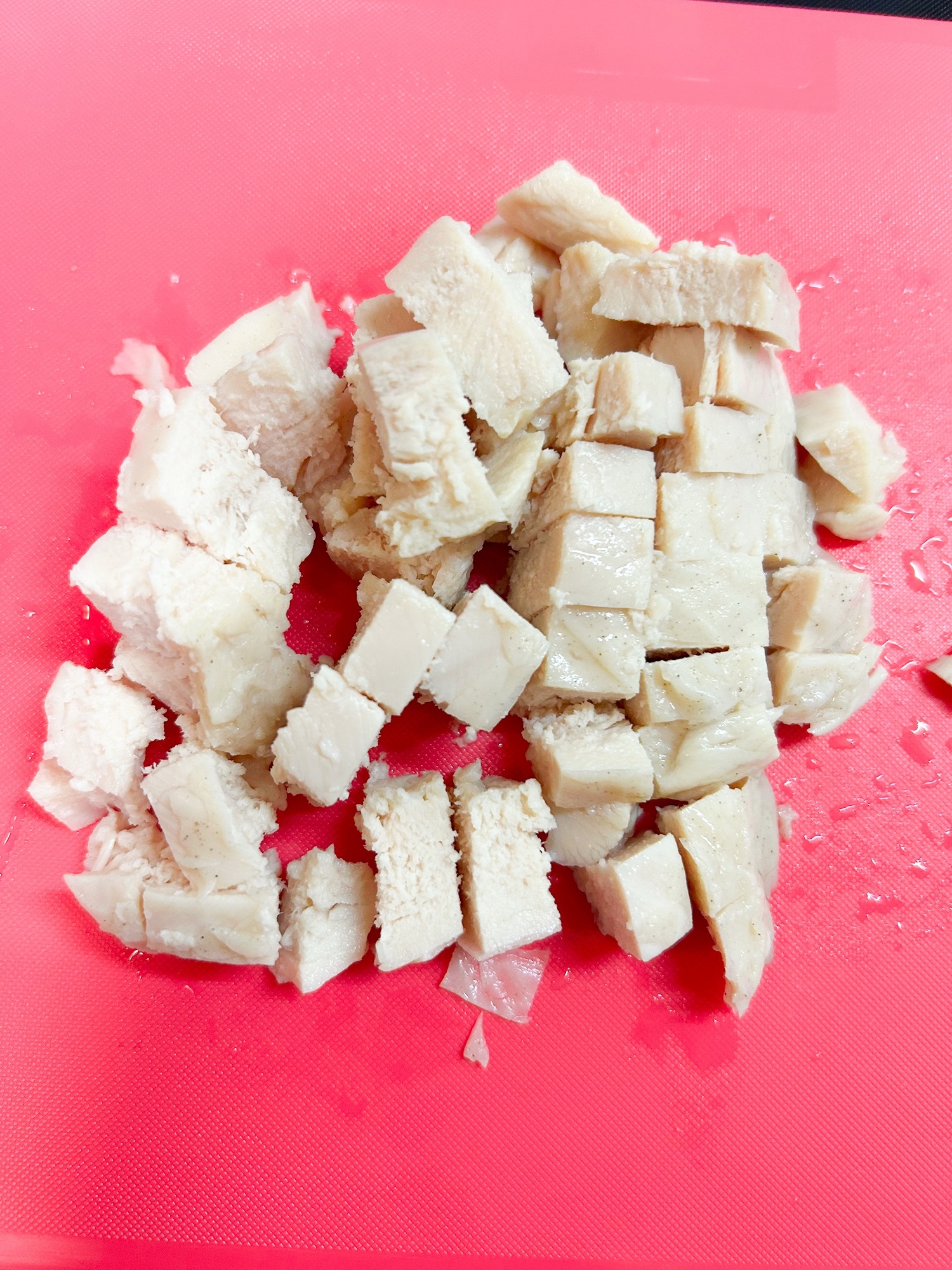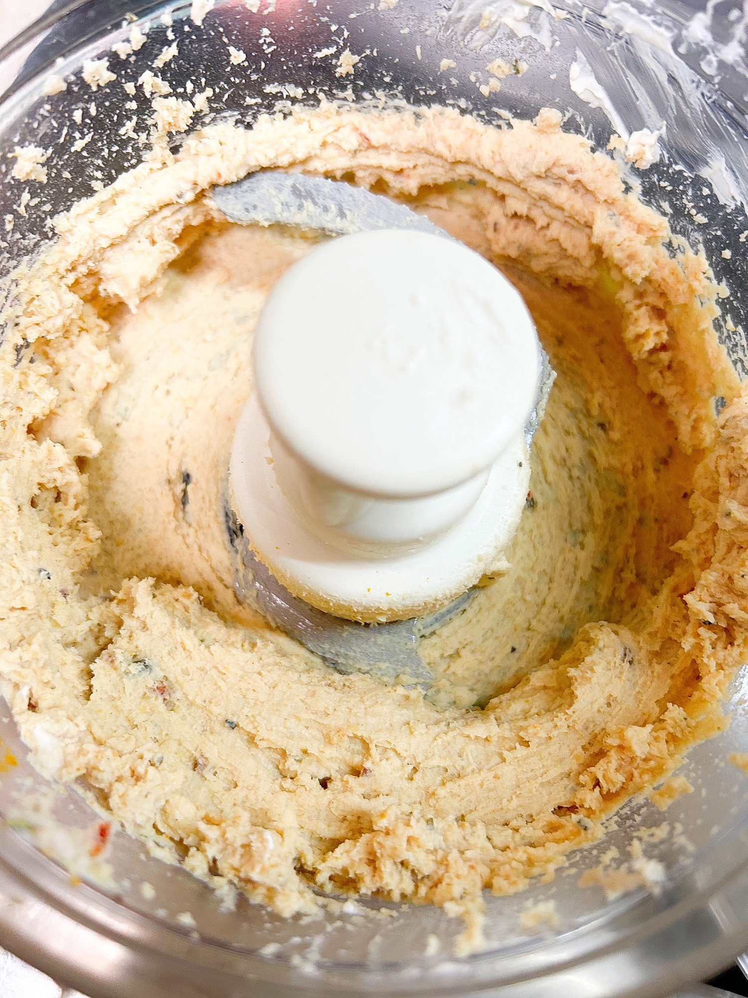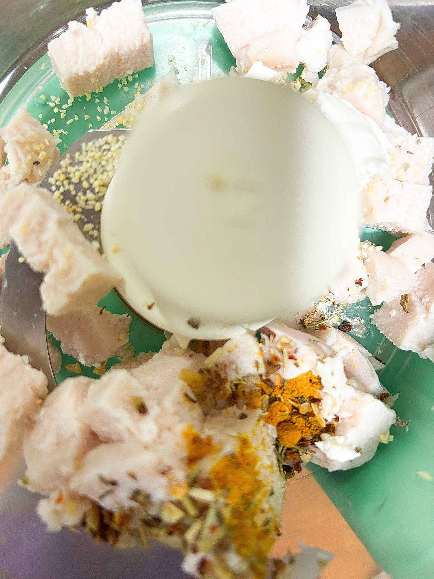 刻んだサラダチキンと◯印の材料を全てフードプロセッサーに入れます。