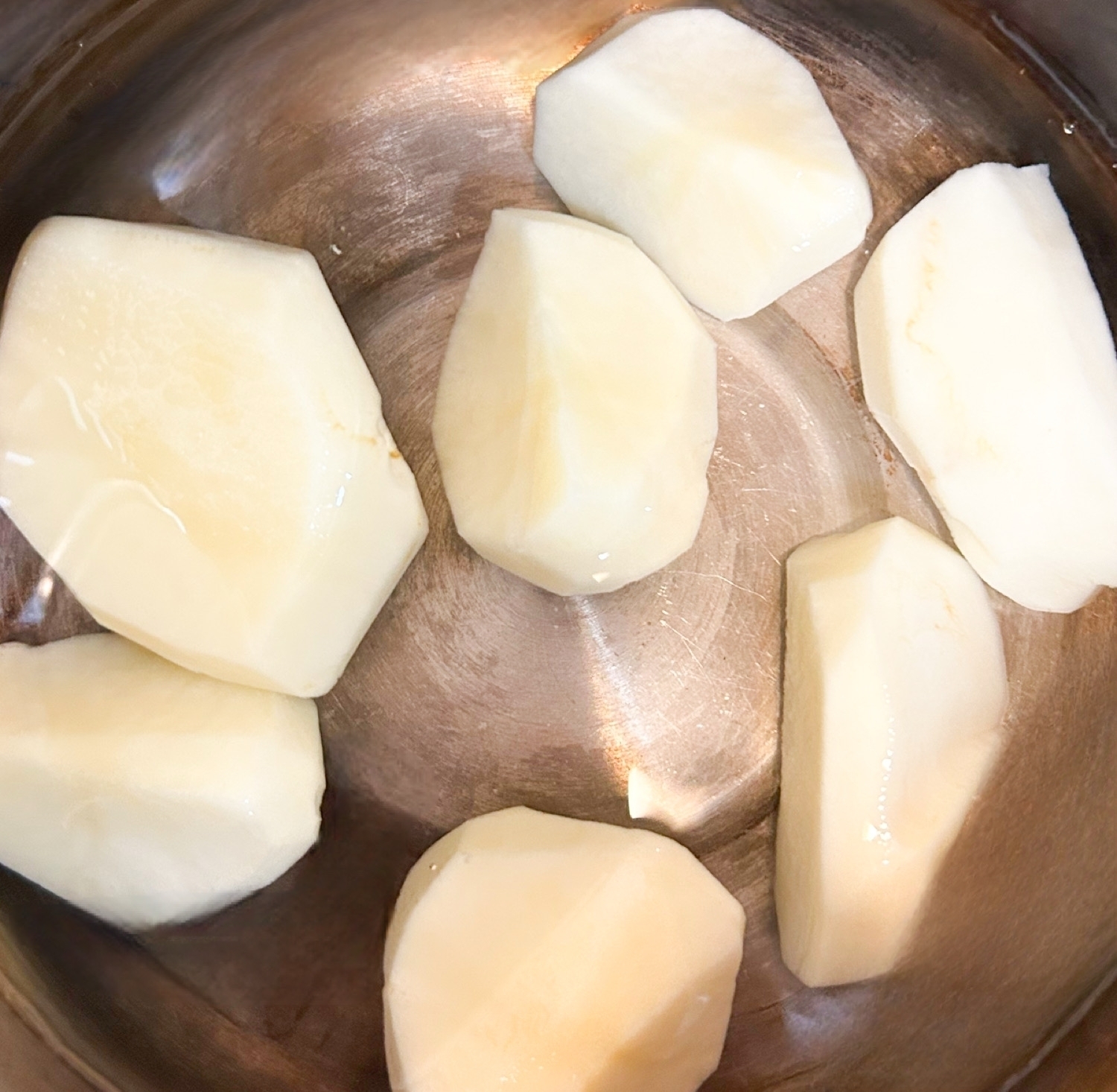 別に下茹でしてあったじゃが芋を加えますが、水を追加するなら是非このじゃが芋を茹でた汁を加えましょう。じゃが芋の旨みが溶け出しています。