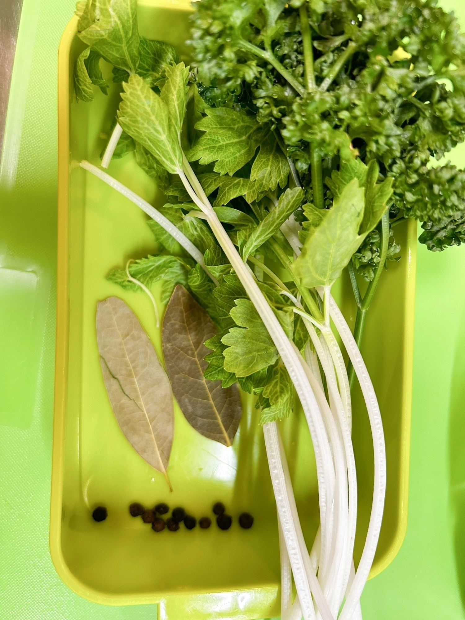 香辛料、ハーブについてはパセリ、セロリ、ローリエという一般的なブーケガルニとブラックペッパーです。(写真のセロリは冷蔵庫にあったサラダセロリを利用したため量が多くなっています)