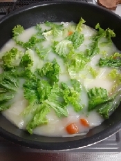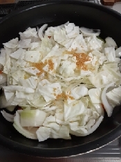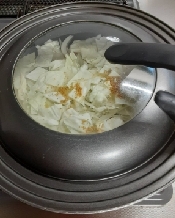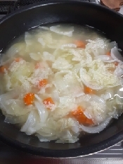 鍋に水を入れて★と「2」のキャベツを入れ、コンソメ顆粒も加え、煮ます。