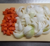 - 2 キャベツの芯部分は別にして、薄くスライスします。その他の部分は、約5cm角に切ります。