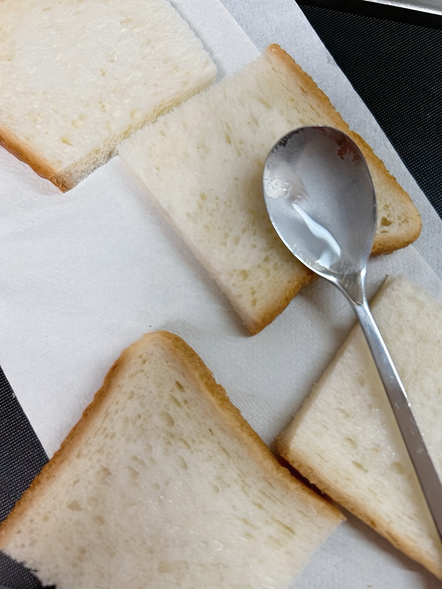 食パン1枚につき4つに切って、それぞれに水溶き片栗粉を塗っておきます。