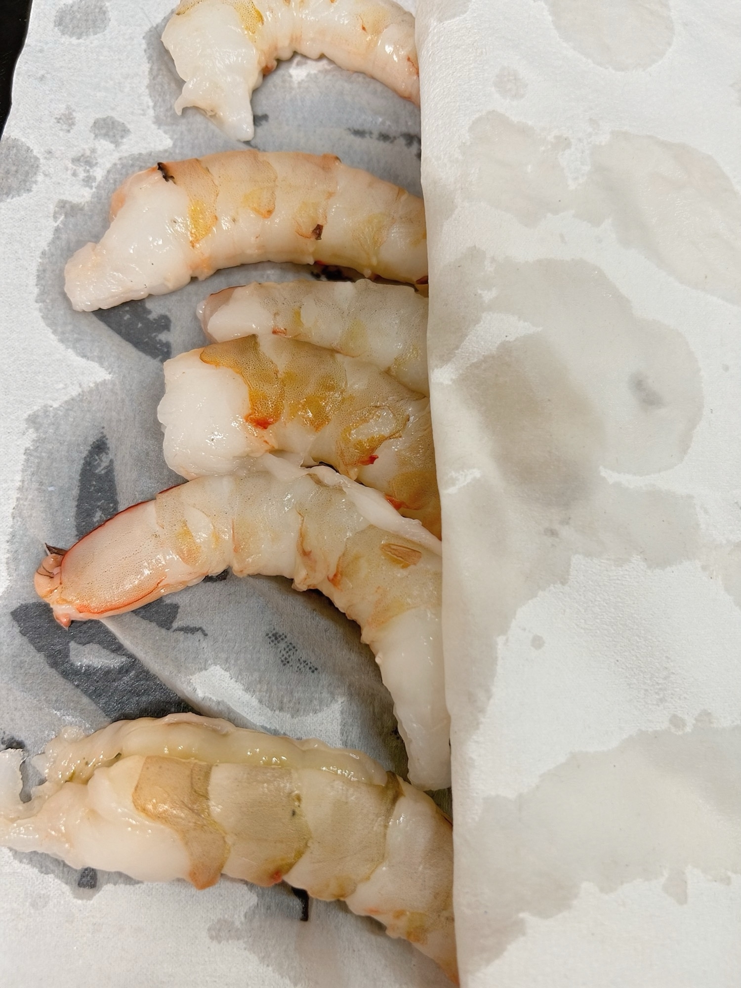 エビはワタを抜きキッチンペーパーで水気を切っておきます。